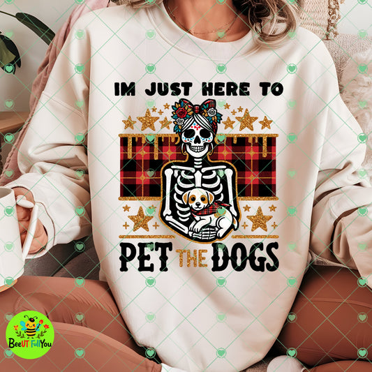 I'm Just Here to Pet the Dogs Skeleton Halloween Dog Lover Sublimation PNG – Funny Plaid Design for DIY Crafts & Apparel
