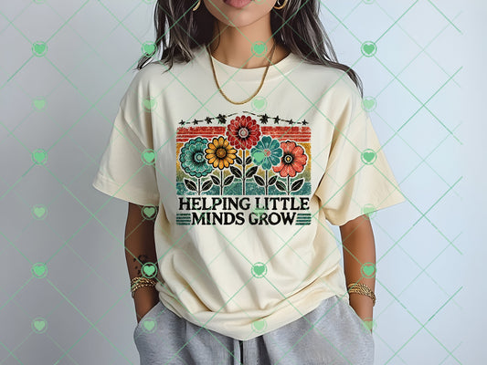 "Helping Little Minds Grow" Teacher-Inspired Retro Flower PNG Design for DTF and Screen Printing - Commercial Use