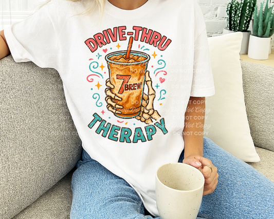 Drive-Thru Therapy – 7 Brew Coffee PNG Design | Funny Caffeine Lover Skeleton Hands | No Additional License Required