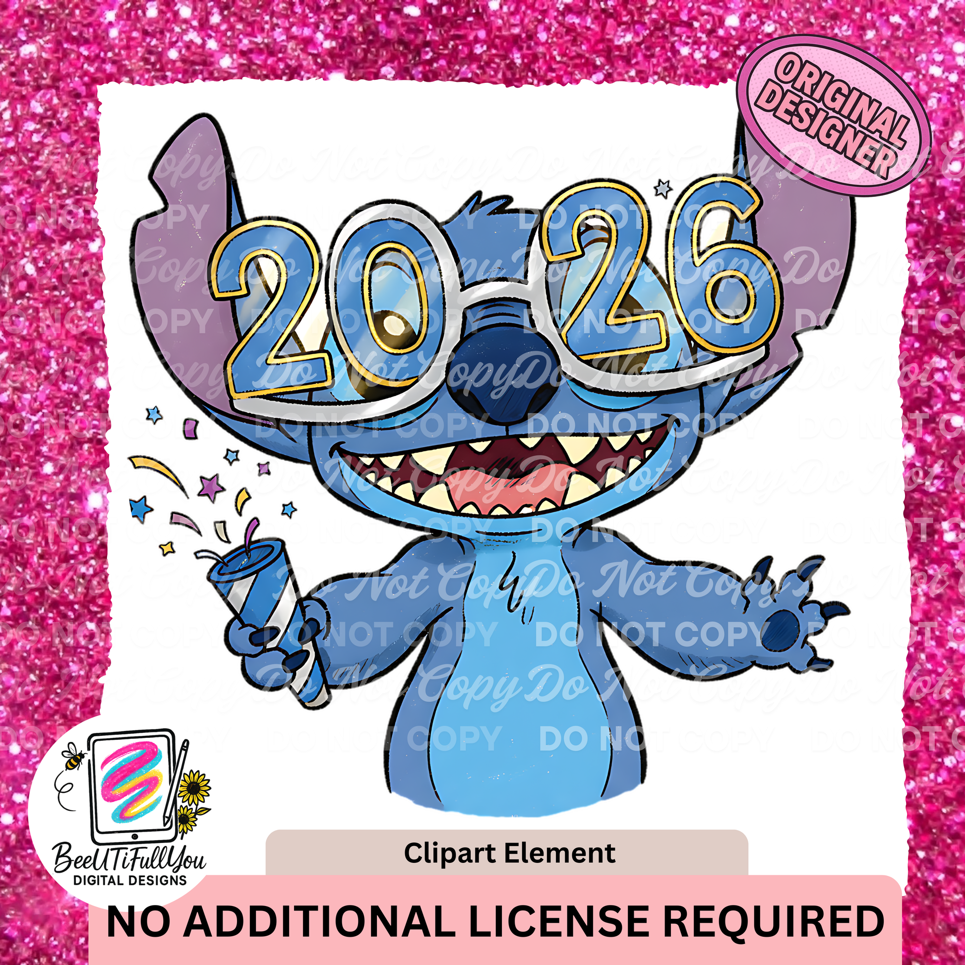 Celebrate the new year with this adorable party-ready blue alien clipart element, complete with “2026” glasses, confetti, and a festive drink. Perfect for New Year’s designs, sublimation projects, planners, and social media graphics!