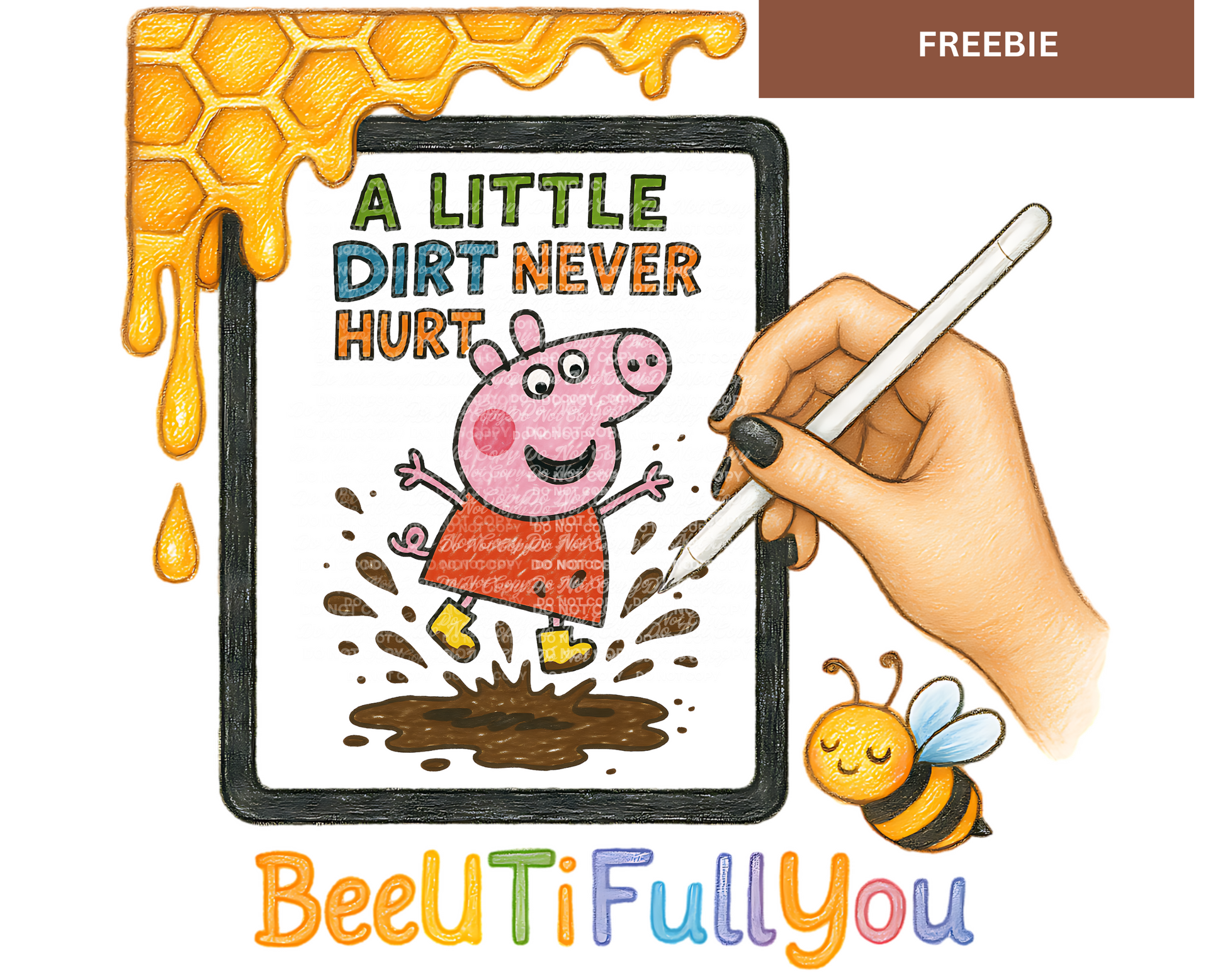Get messy in style with this A Little Dirt Never Hurt freebie design! 🐷💦 Featuring a happy, muddy pig splashing in puddles with colorful playful text, this high-quality PNG is perfect for kids’ shirts, tote bags, mugs, and more.
