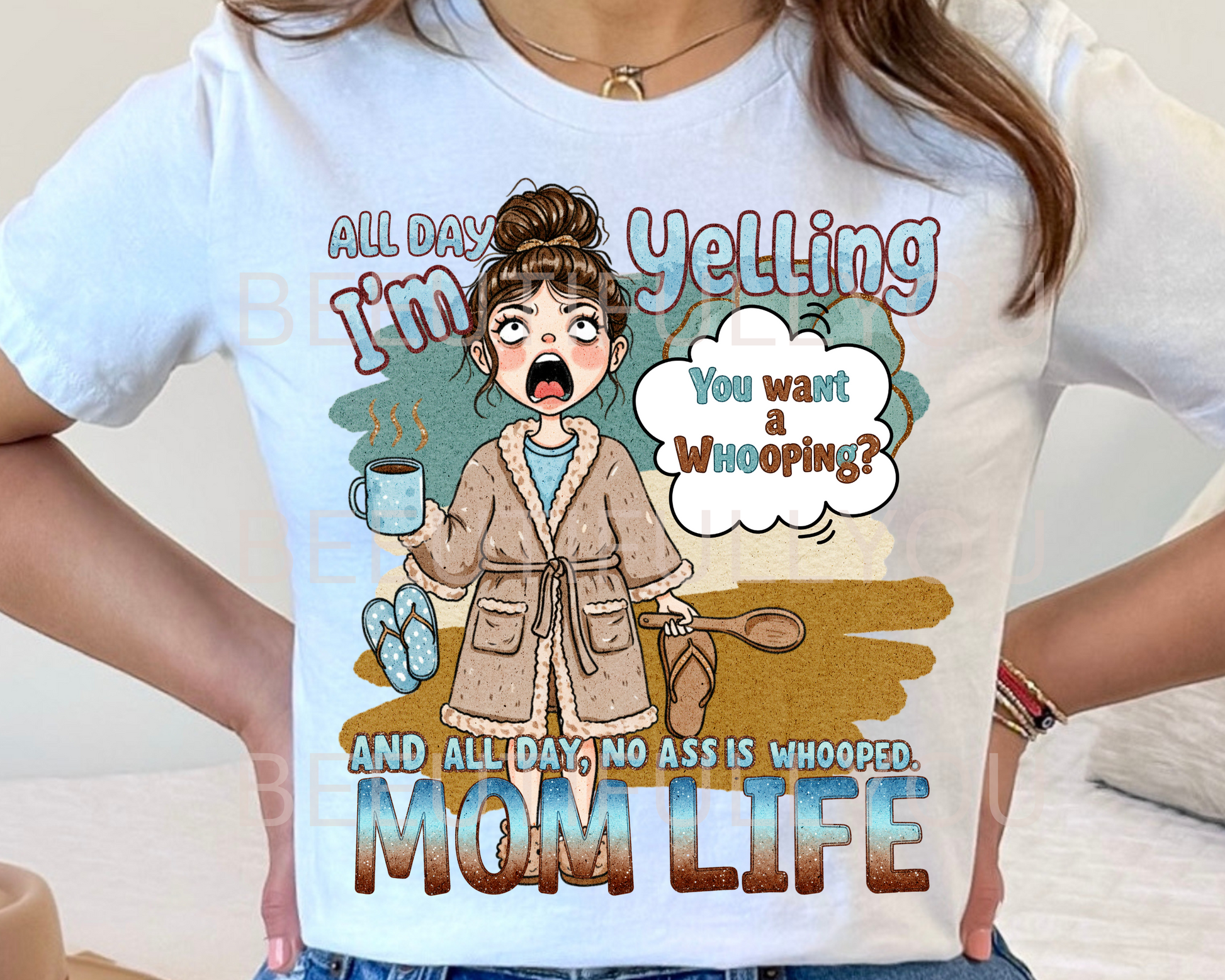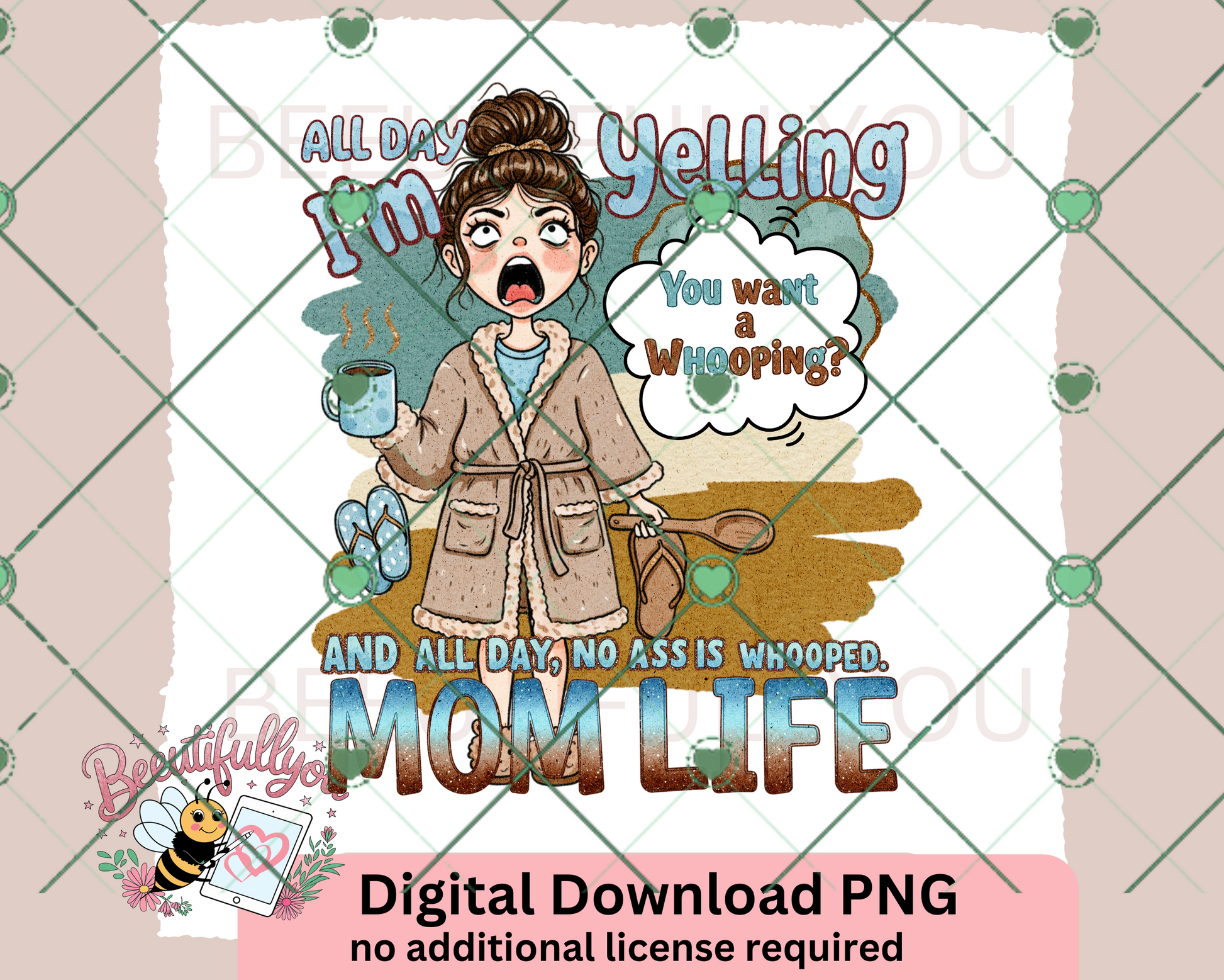 For the exhausted moms out there, this "All Day I’m Yelling, You Want a Whooping? And All Day, No Ass is Whooped – Mom Life" digital PNG design sums it up perfectly! Featuring a stressed-out mom in a cozy robe, coffee in hand, and slippers nearby, this design is a hilarious and relatable take on modern motherhood. Perfect for shirts, mugs, tumblers, and gifts for all the tired, overworked moms who keep the chaos running!