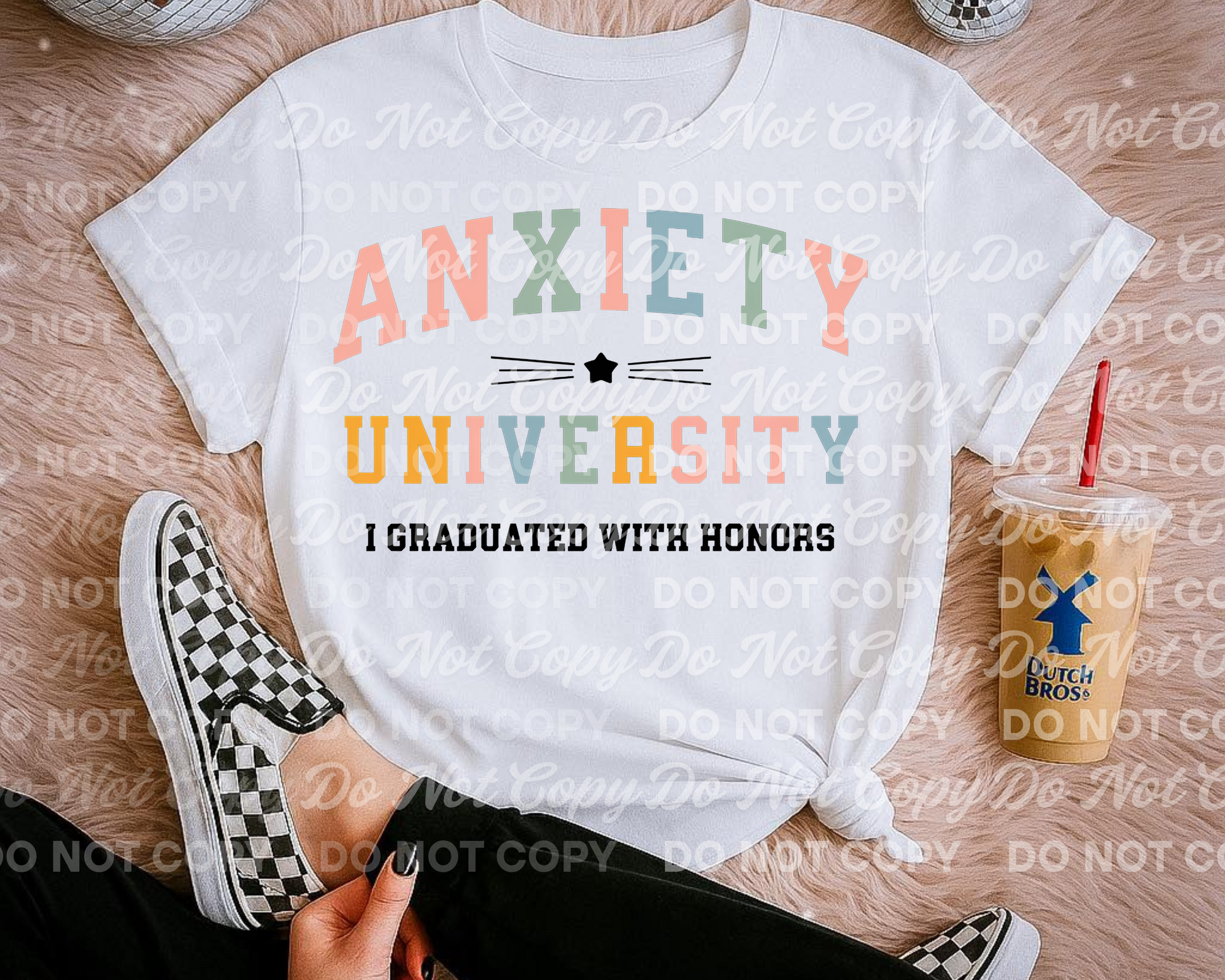 Celebrate your “degree” in overthinking with this Anxiety University – I Graduated with Honors PNG! Featuring colorful varsity-style text and a playful star accent, this design is perfect for humor-driven mental health merch. Works great for shirts, mugs, totes, stickers, and more.