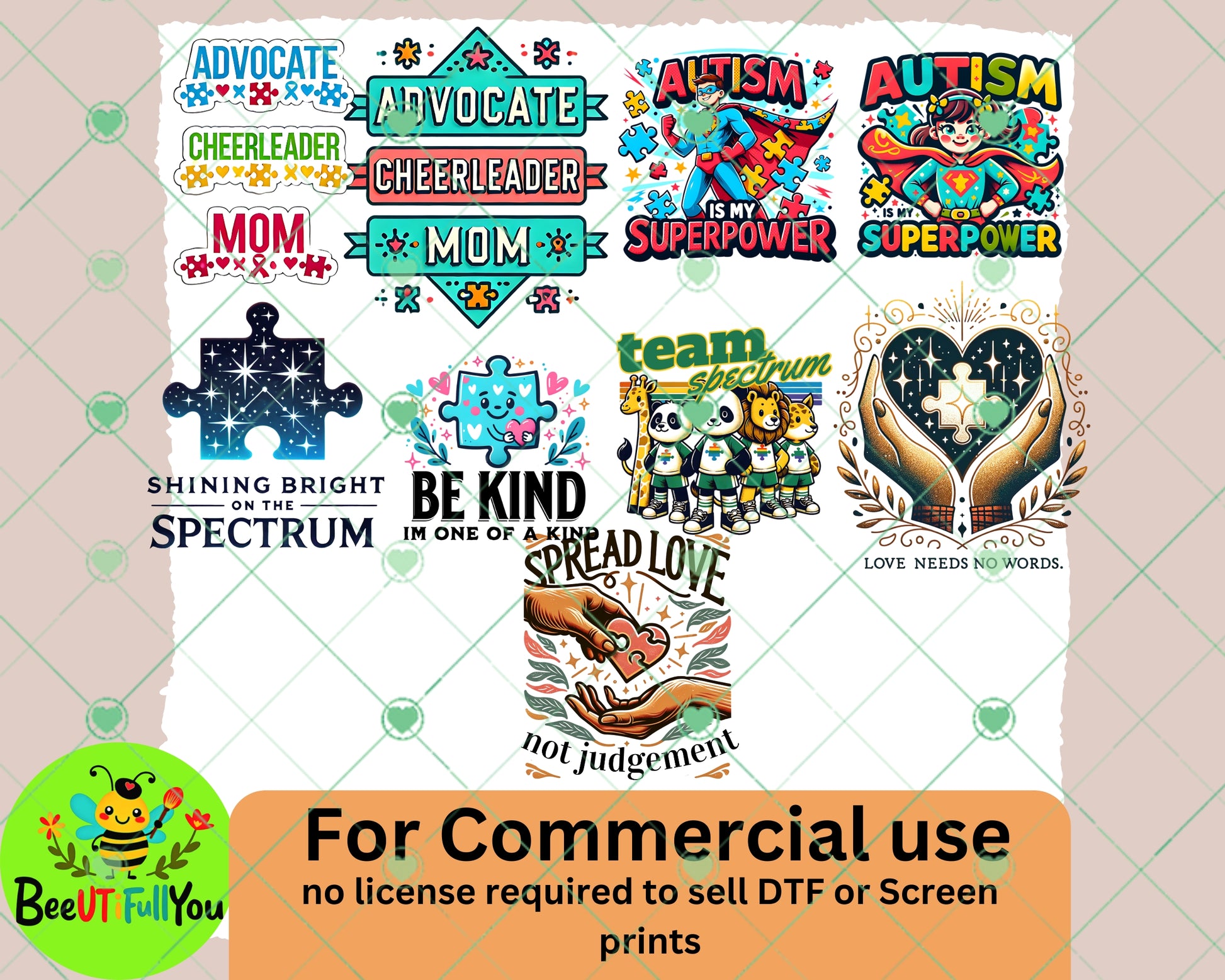 Autism Awareness PNG Bundle β Advocate Mom, Superpower, Team Spectrum, Puzzle Designs for Sublimation, DTF & Screen Printing