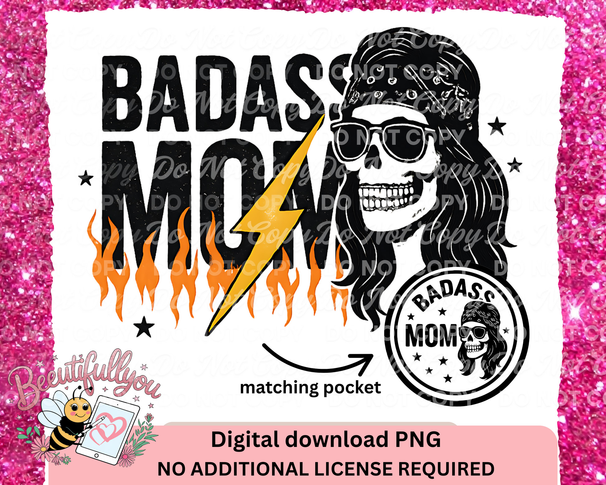 For the moms who run on caffeine, chaos, and pure attitude — this Badass Mom PNG features a skull in a bandana and shades, framed by bold flames and a lightning bolt. Comes with a matching pocket graphic, perfect for tee fronts and sleeves.