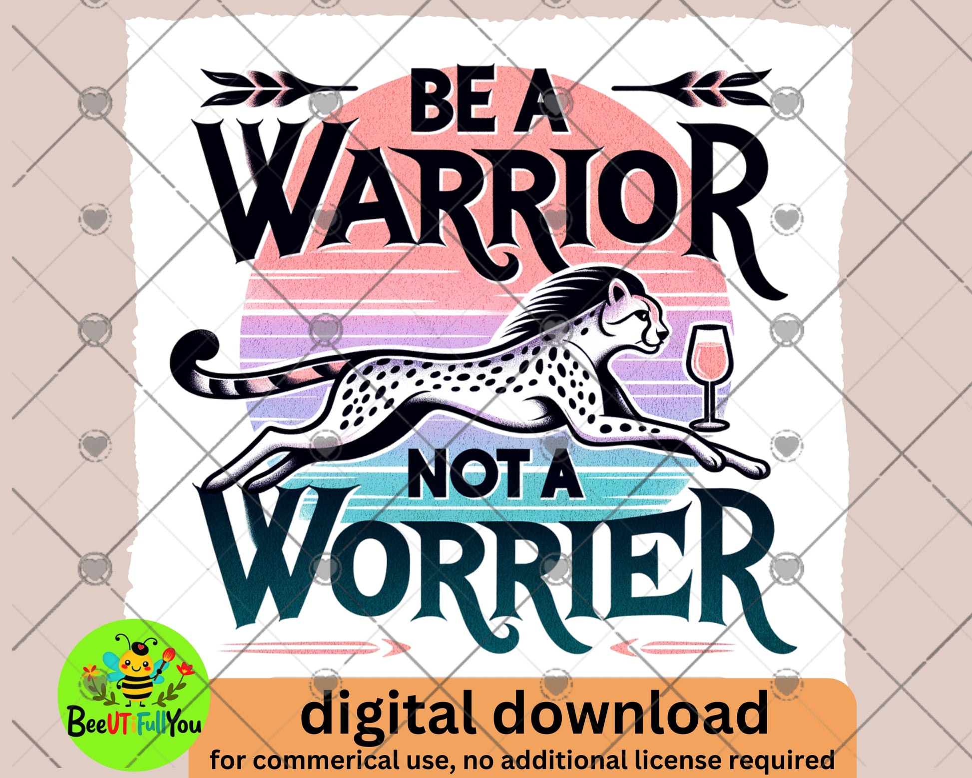 Unleash your inner strength and embrace positivity with this stunning "Be a Warrior Not a Worrier" digital PNG design. Featuring a graceful cheetah leaping across a vibrant, retro-inspired gradient background, this design is the perfect blend of elegance and motivation. The empowering quote serves as a reminder to tackle life's challenges head-on with confidence and grace.