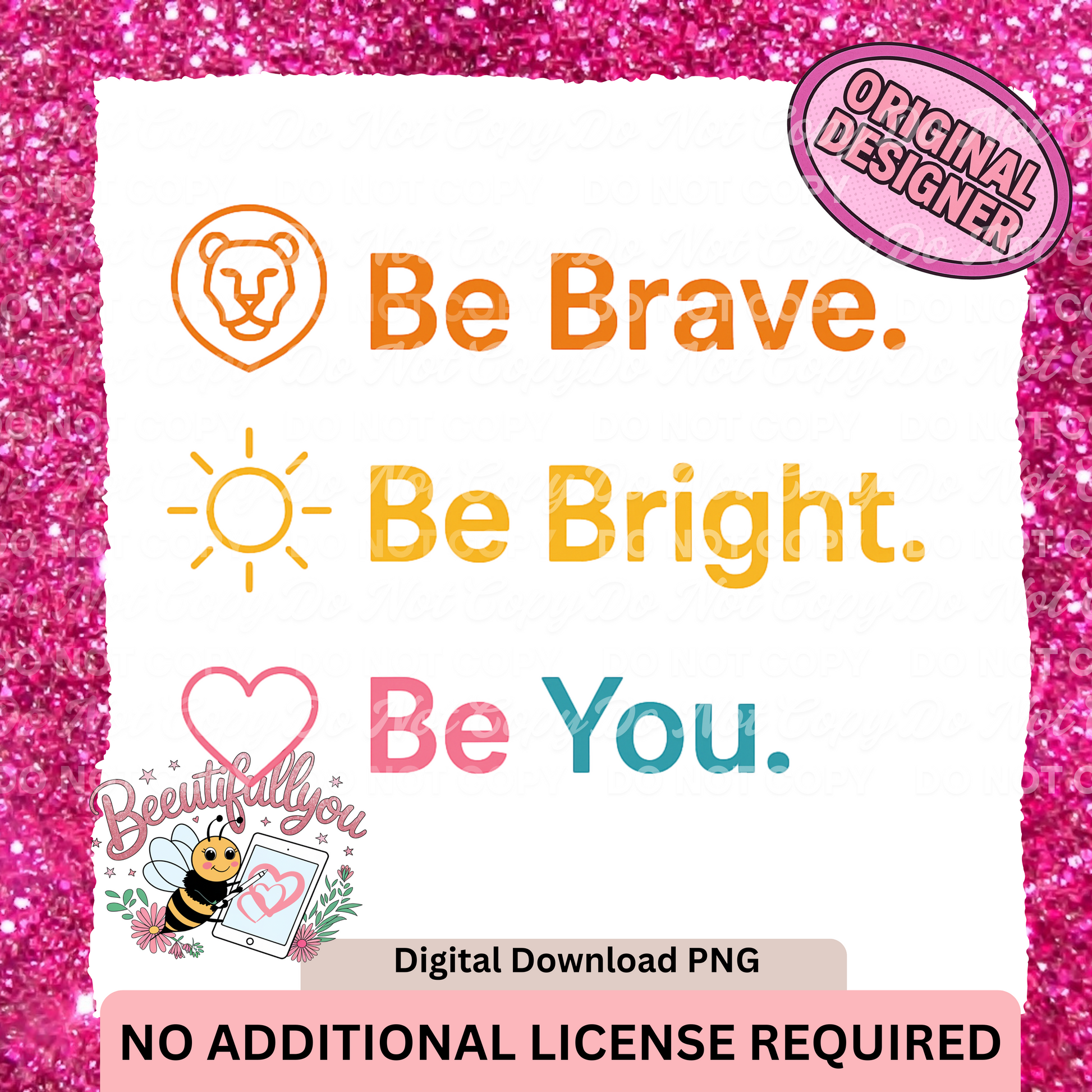 Inspire kindness, confidence, and self-expression with this uplifting โBe Brave. Be Bright. Be You.โ PNG! Designed with warm gradient tones and matching icons (lion, sun, heart), this piece adds an encouraging touch to classroom decor, apparel, and accessories.