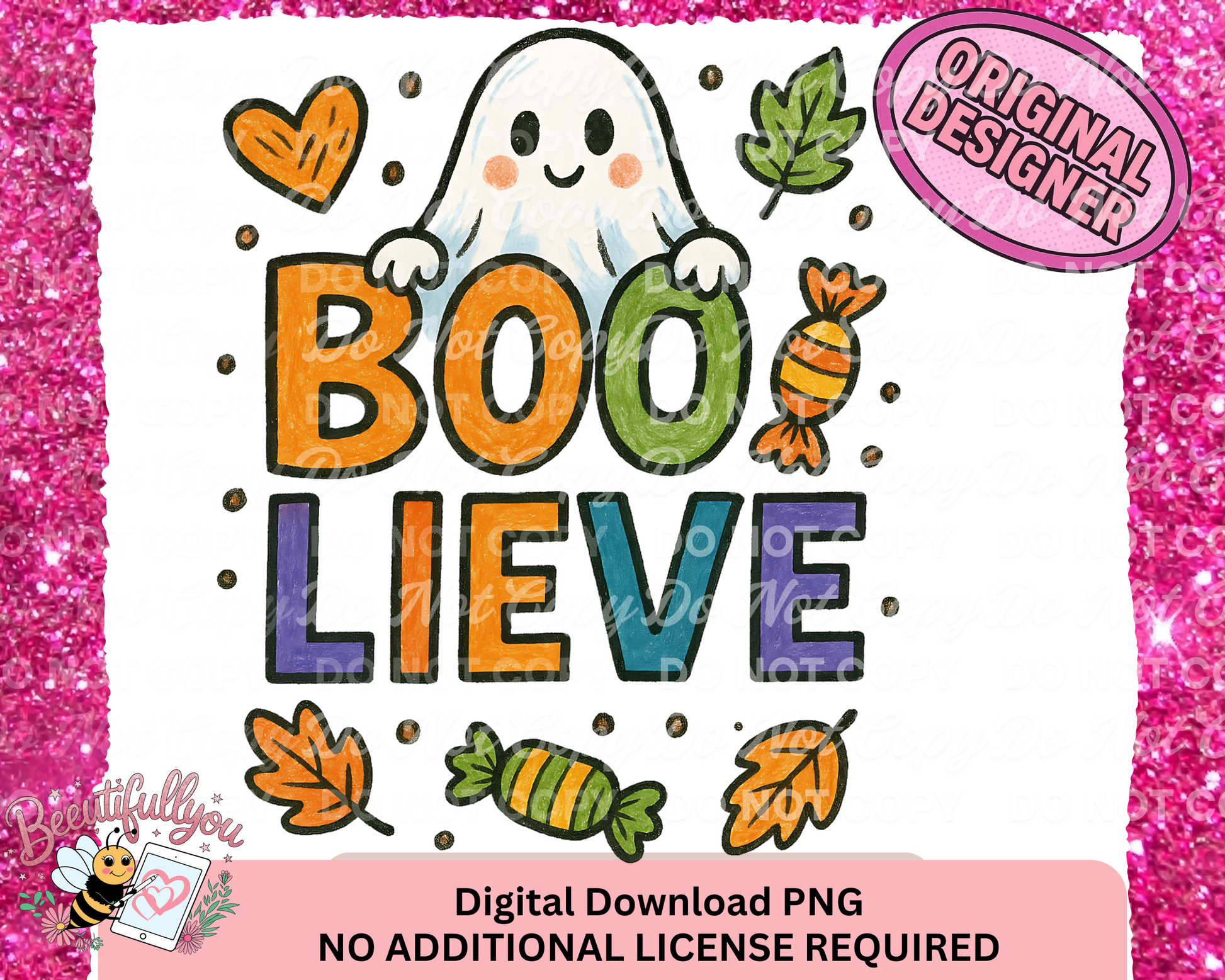 BOO-Lieve PNG | Cute Halloween Ghost with Candy Fall Leaves Digital Download