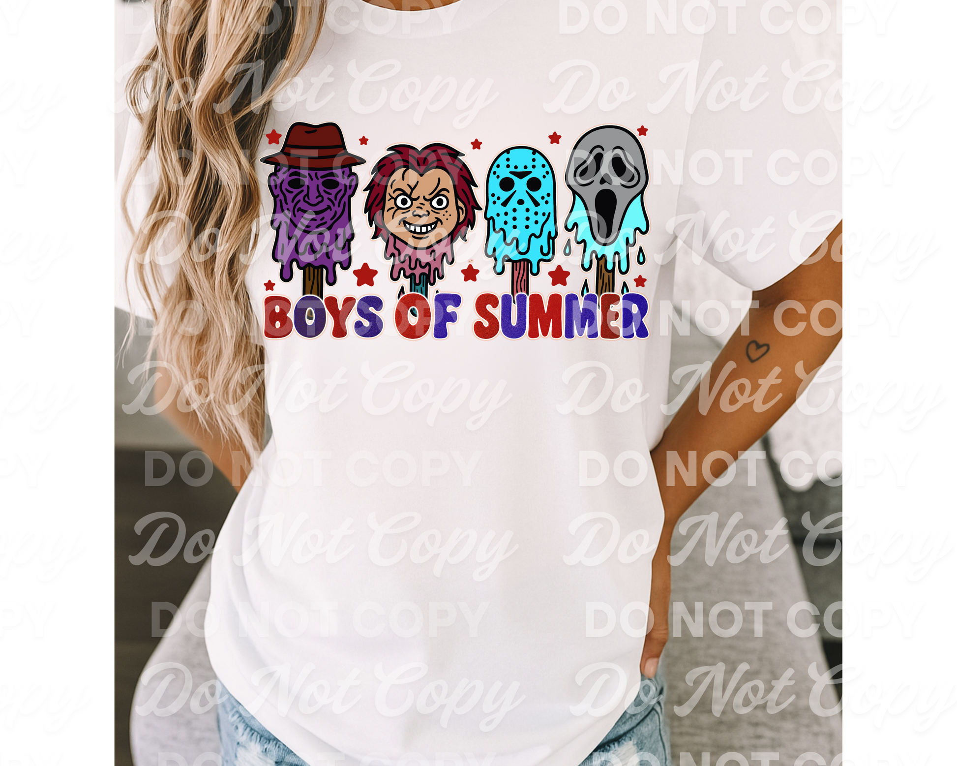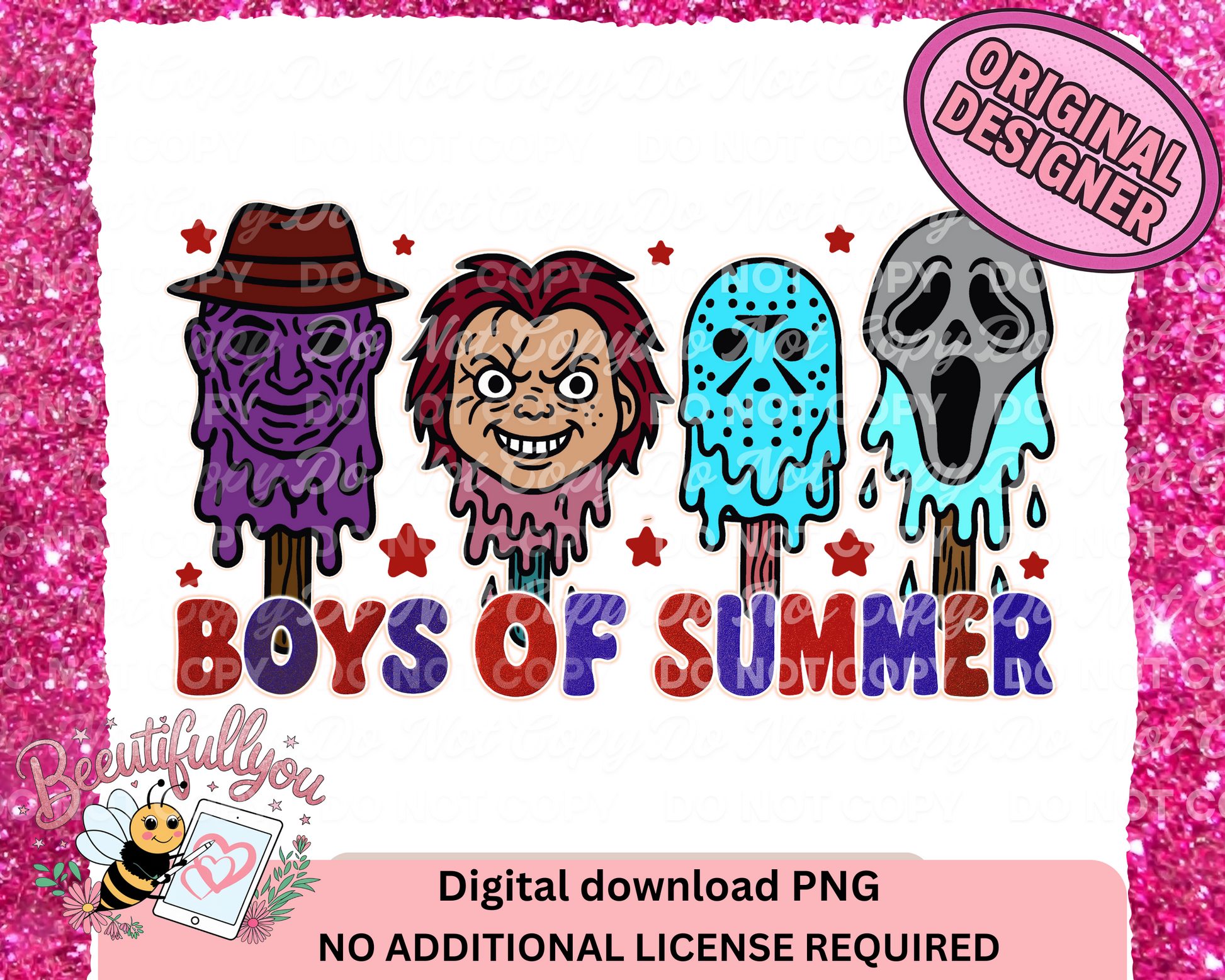 Turn up the heat and the horror with this Boys of Summer digital design! Featuring melted popsicle versions of Freddy Krueger, Chucky, Jason Voorhees, and Ghostface, this playful and creepy PNG is perfect for spooky summer creations.
