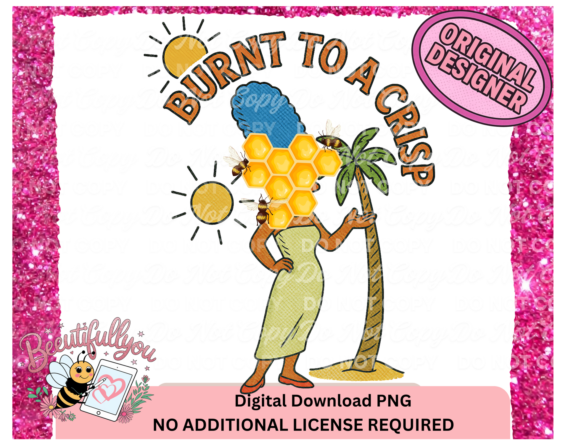 This hilarious PNG features a sun-scorched Marge Simpson with the phrase “Burnt to a Crisp,” palm trees, and bright summer suns—perfect for beach shirts, vacation gear, or sassy summer apparel. It’s a fun design for anyone who knows the real summer struggle!