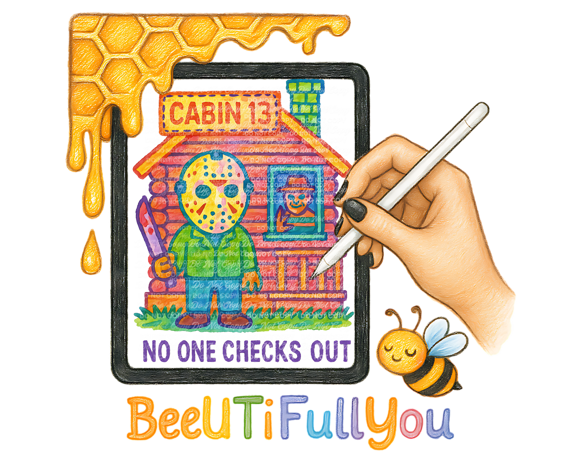 Check into Cabin 13—if you dare! This spooky-cute crayon-style PNG features Jason on the porch and Freddy’s eerie reflection in the window. A colorful and creepy design perfect for Halloween shirts, horror camp tees, or sleepover-themed merch!