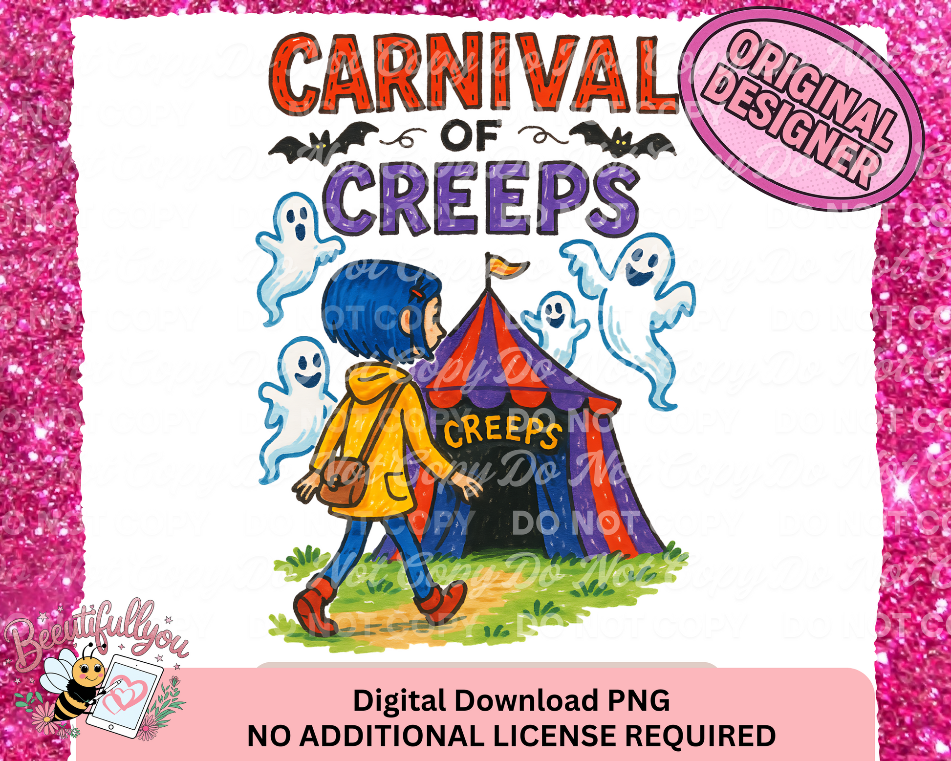 Step right up… if you dare! This creepy-cute digital download features a spooky carnival tent surrounded by playful ghosts and a curious character braving the entrance. Perfect for Halloween lovers and fans of eerie whimsy!