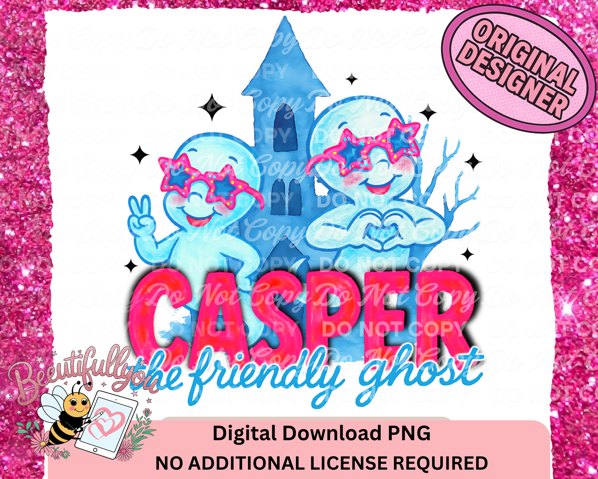This playful and trendy Casper the Friendly Ghost PNG design is perfect for Halloween-themed physical products! Featuring cute hand-drawn ghosts wearing star sunglasses and a haunted house in the background, this high-resolution PNG is ideal for shirts, totes, and more.