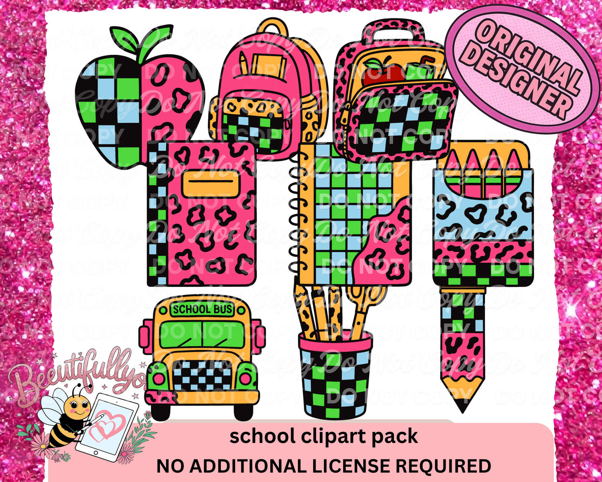 Colorful School Clipart Set – Checkered & Leopard Back to School Bundle clipart