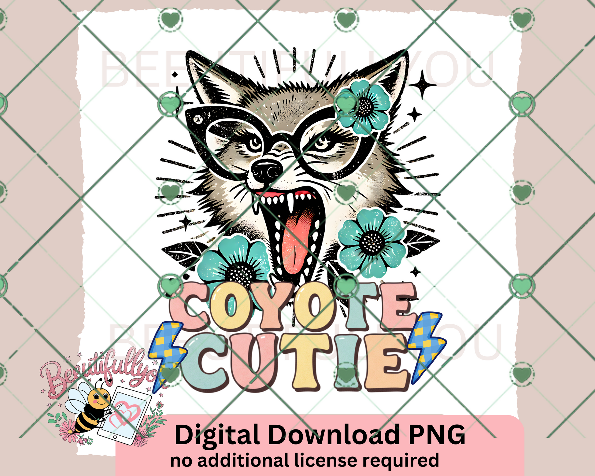 Add some wild desert sass to your next tee with this Coyote Cutie PNG! Featuring a fierce coyote in retro glasses and flower accents with bold lightning bolts, this design is perfect for lovers of the wild west, boho babes, and cowgirl vibes.