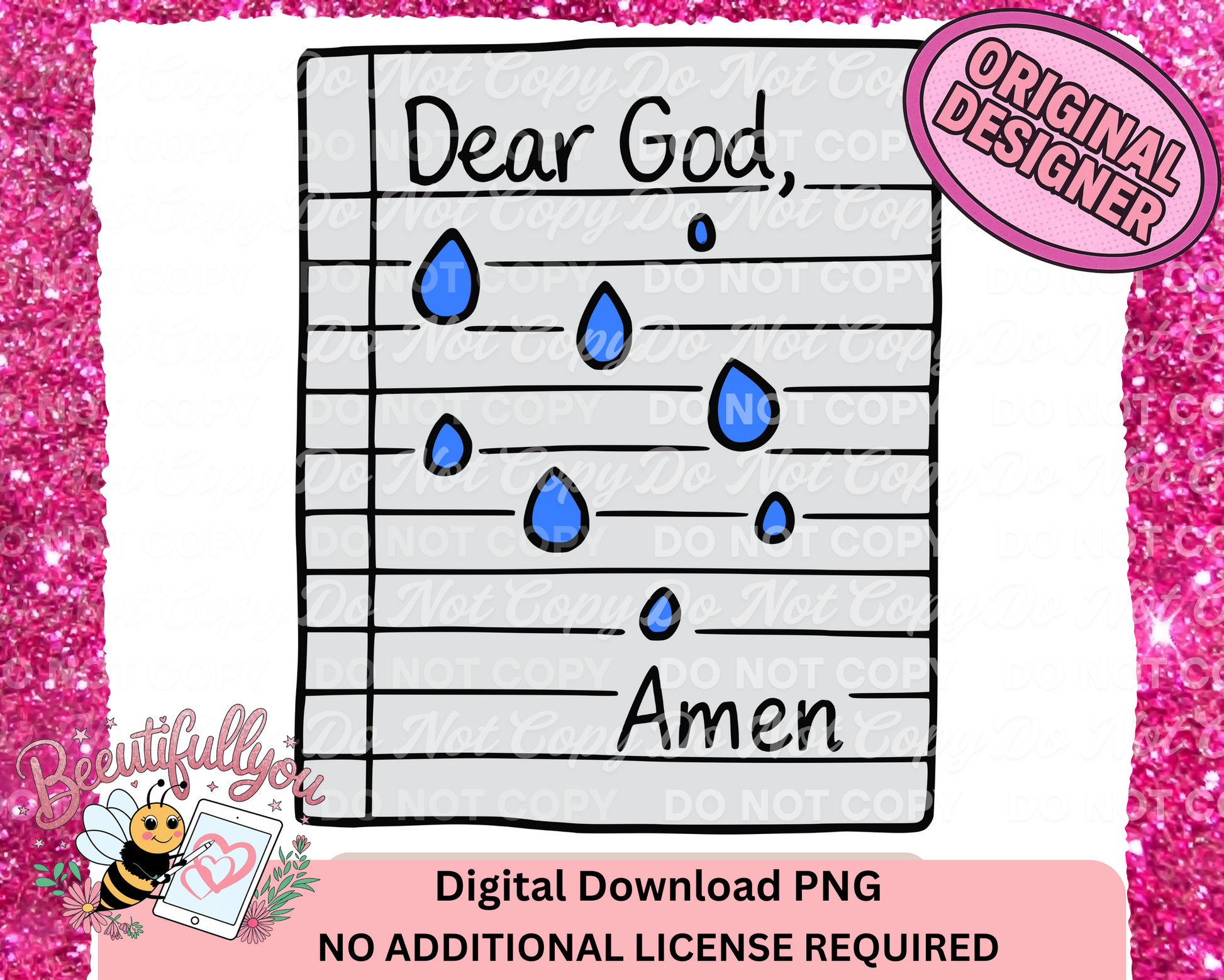 This touching and emotional design features a hand-drawn notebook page with the heartfelt message: "Dear God, Amen" and illustrated blue tears. A simple yet powerful representation of wordless prayers and quiet strength.