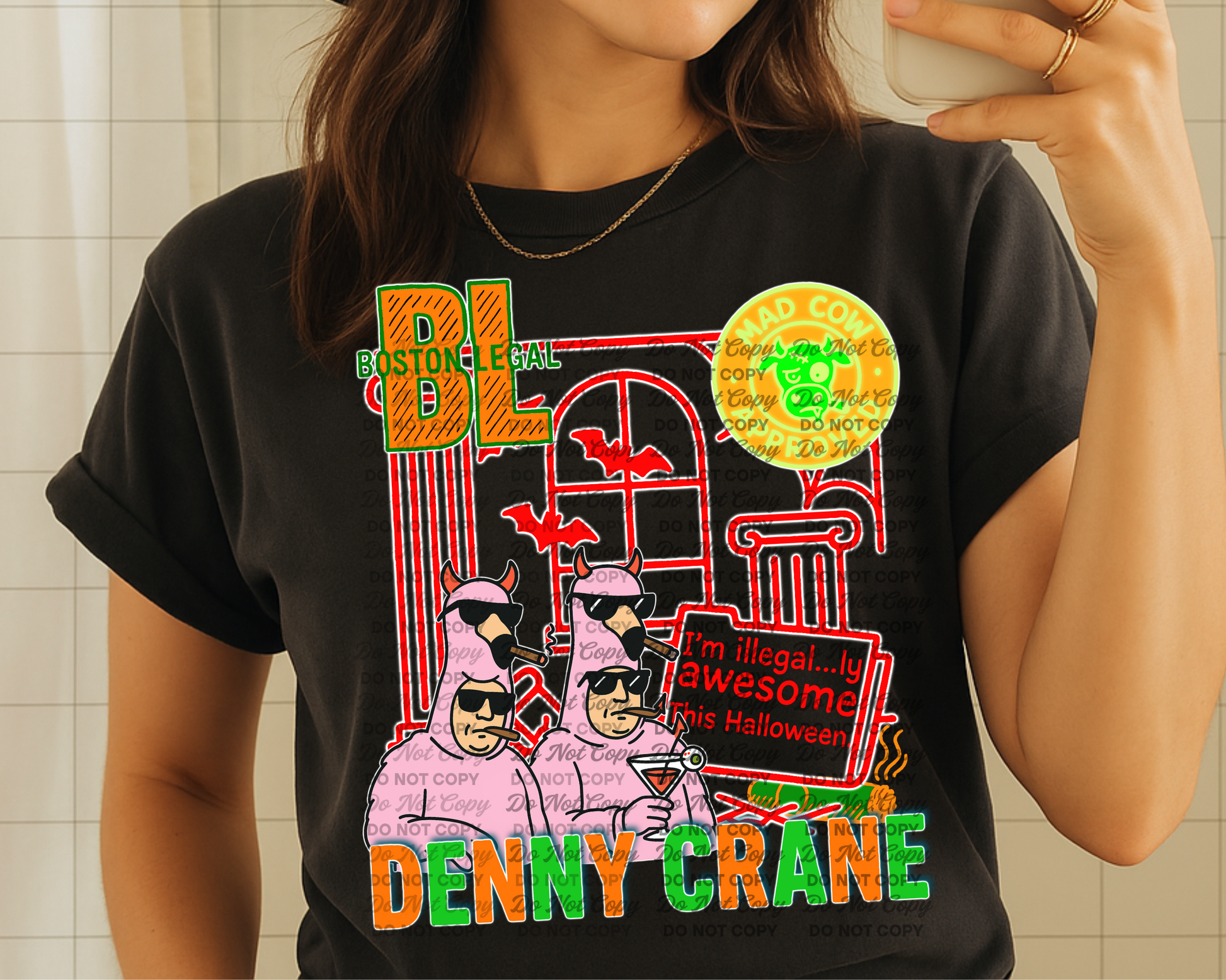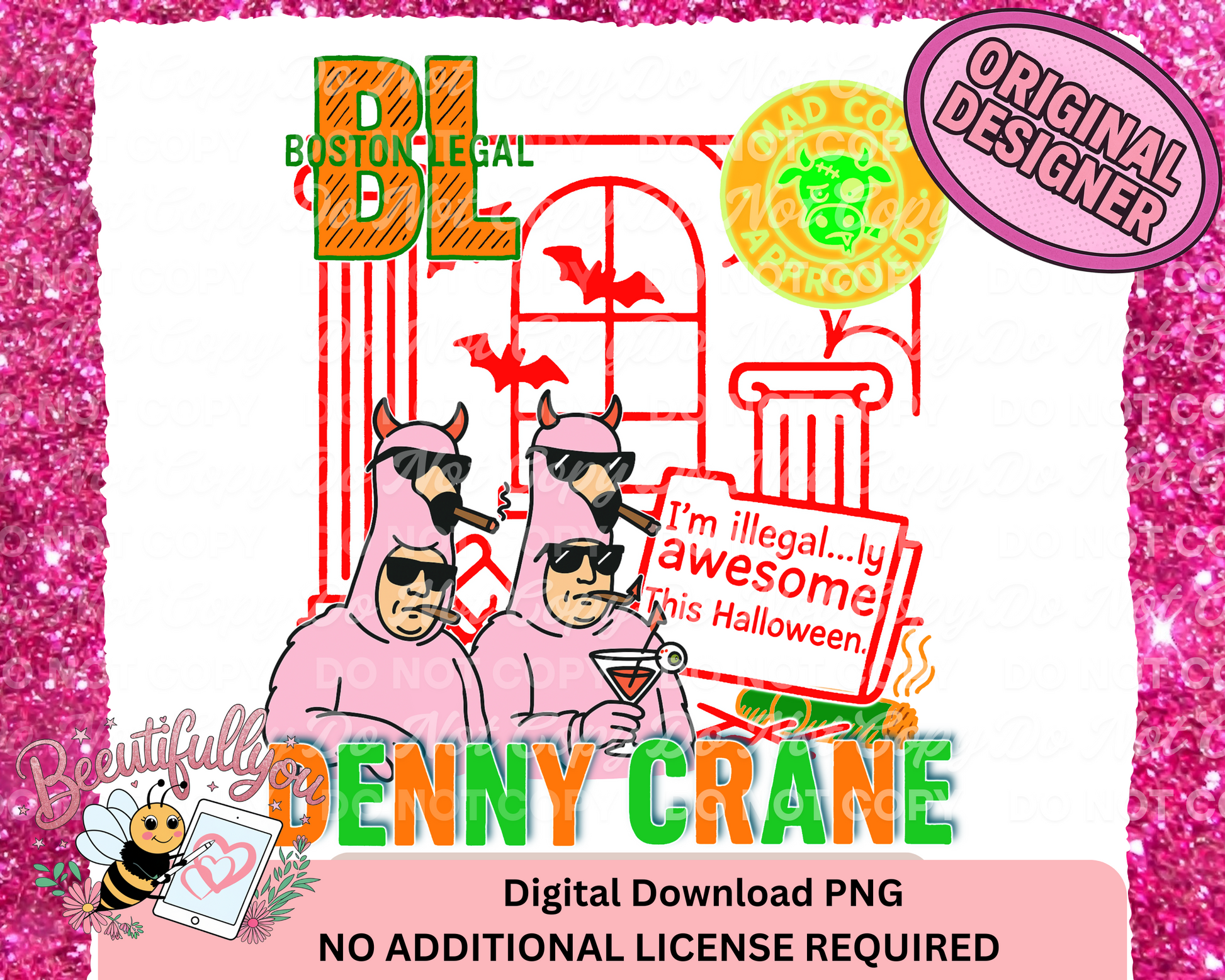 This hilarious Halloween PNG features the iconic Denny Crane from Boston Legal and his crew in ridiculous pink cow costumes, smoking cigars and sipping martinis. With bats, courthouse columns, and the quote “I’m illegal...ly awesome this Halloween,” it’s the perfect satirical design for legal fans and pop culture lovers.