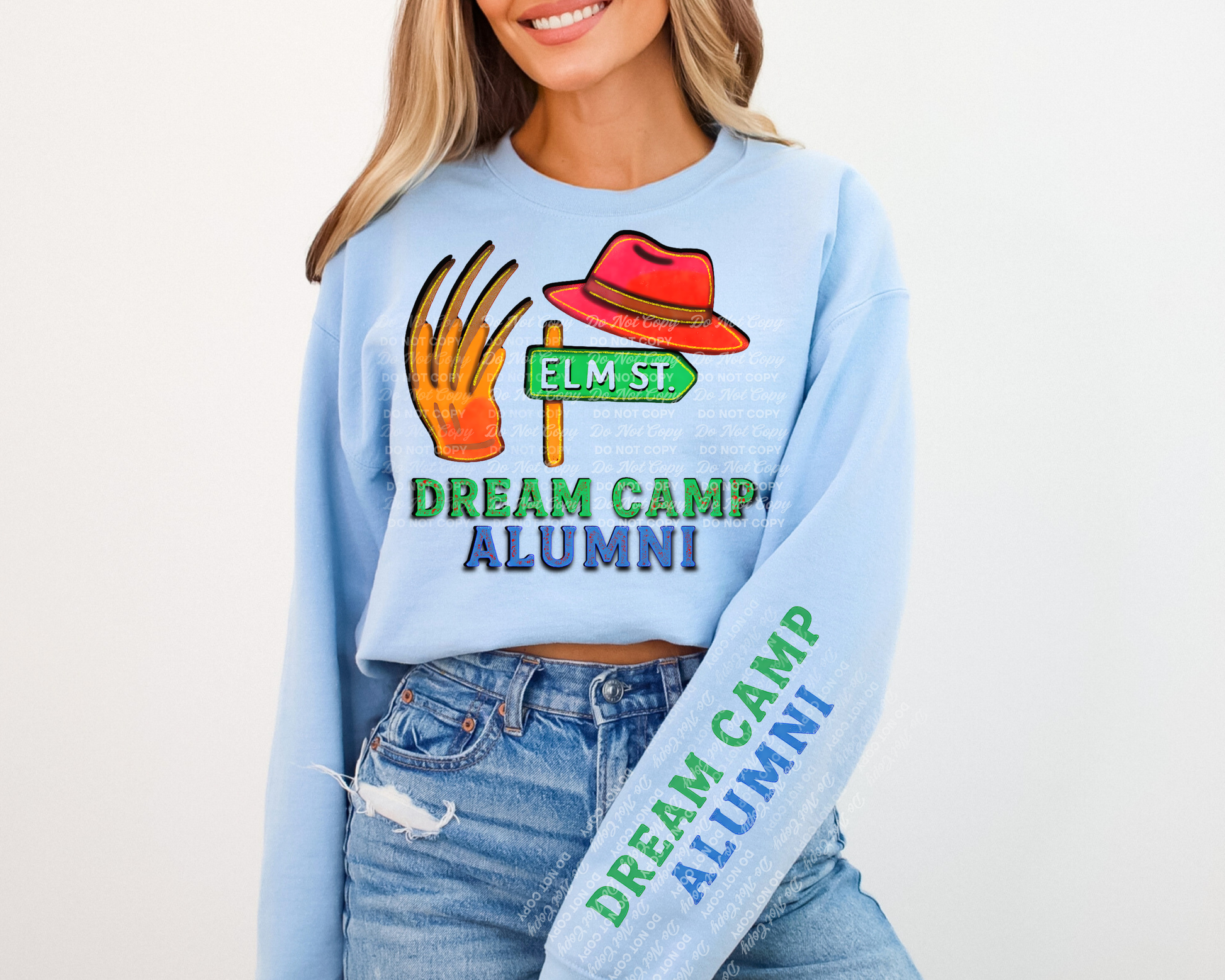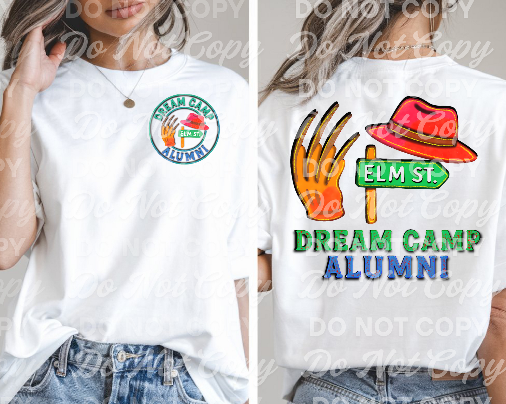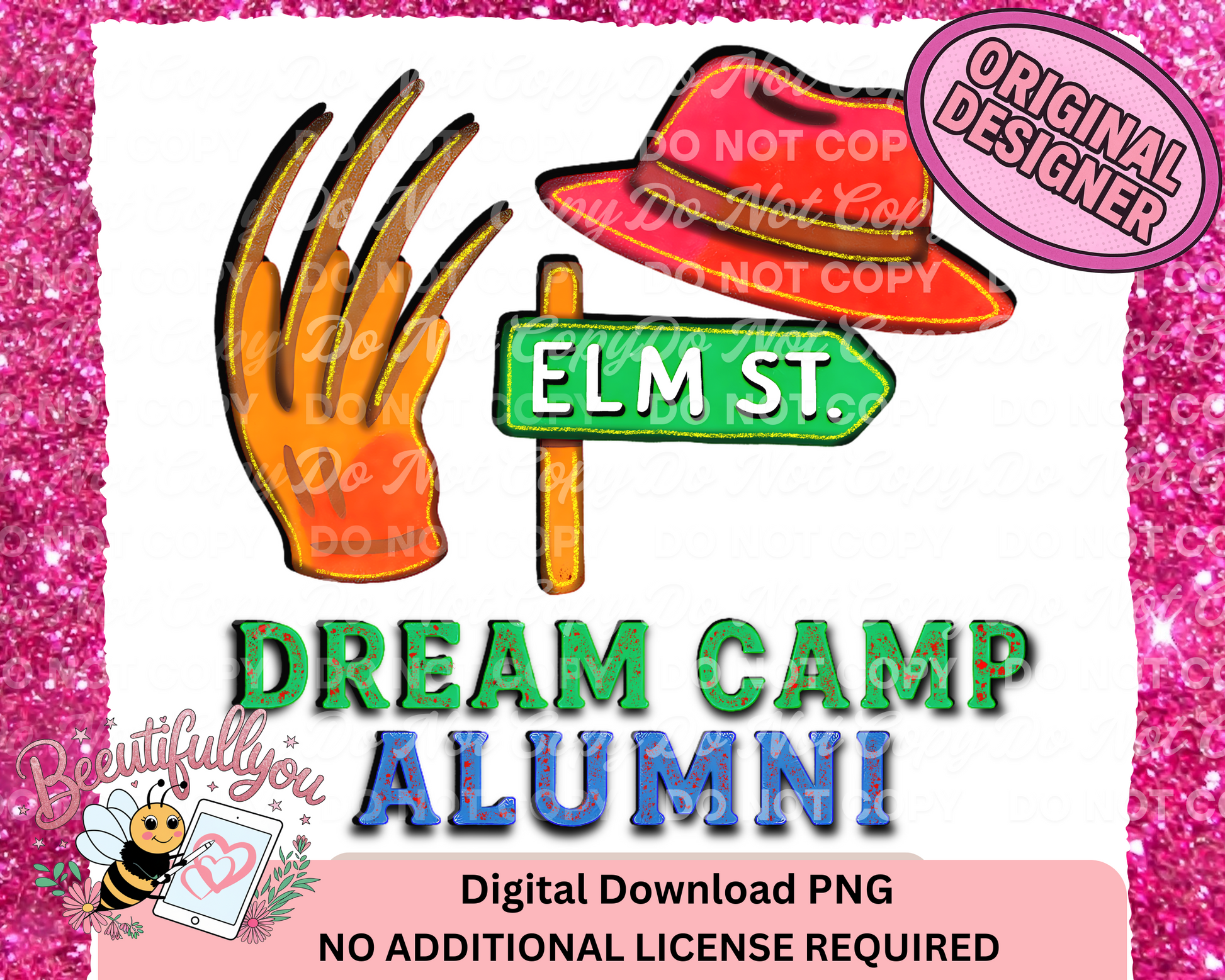 This spooky and fun “Dream Camp Alumni” PNG features a nod to the iconic Elm Street legend—complete with Freddy’s glove, red fedora, and a campy street sign. A perfect addition to any horror-themed camp shirt, sleepover tee, or Halloween drop!