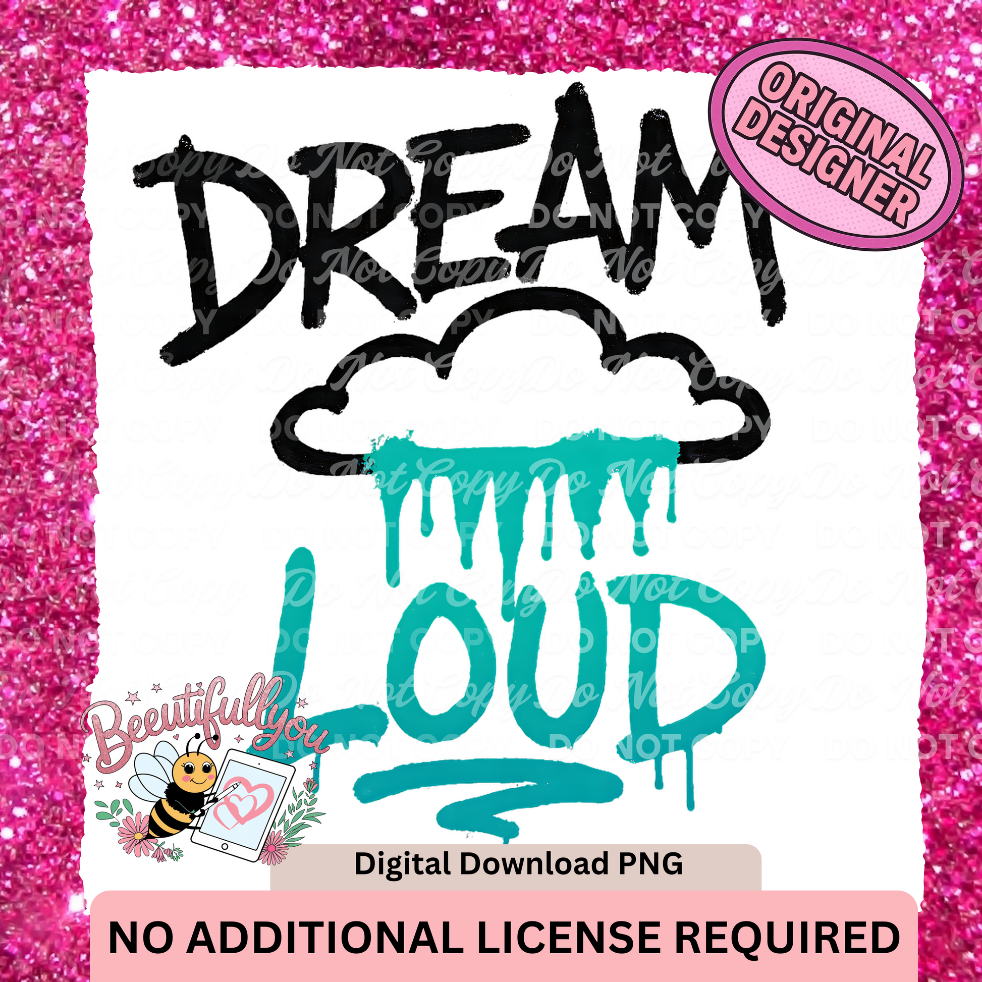 Why dream small when you can Dream Loud? This bold and artsy PNG design features a grunge-style cloud with dripping teal accents and graffiti-inspired lettering—perfect for creators, dreamers, and doers who make noise with their vision.