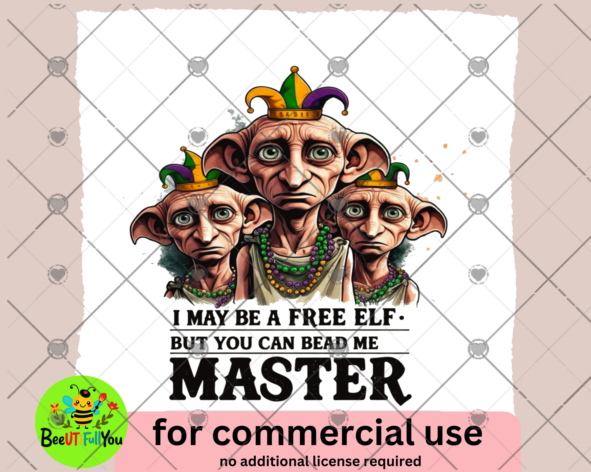 This hilarious high-resolution PNG design features a free elf celebrating Mardi Gras, perfect for adding a touch of fantasy and humor to your Carnival creations. With the funny "I may be a free elf, but you can bead me master" quote, this design is sure to be a hit! Ideal for t-shirts, mugs, decorations, and more!
