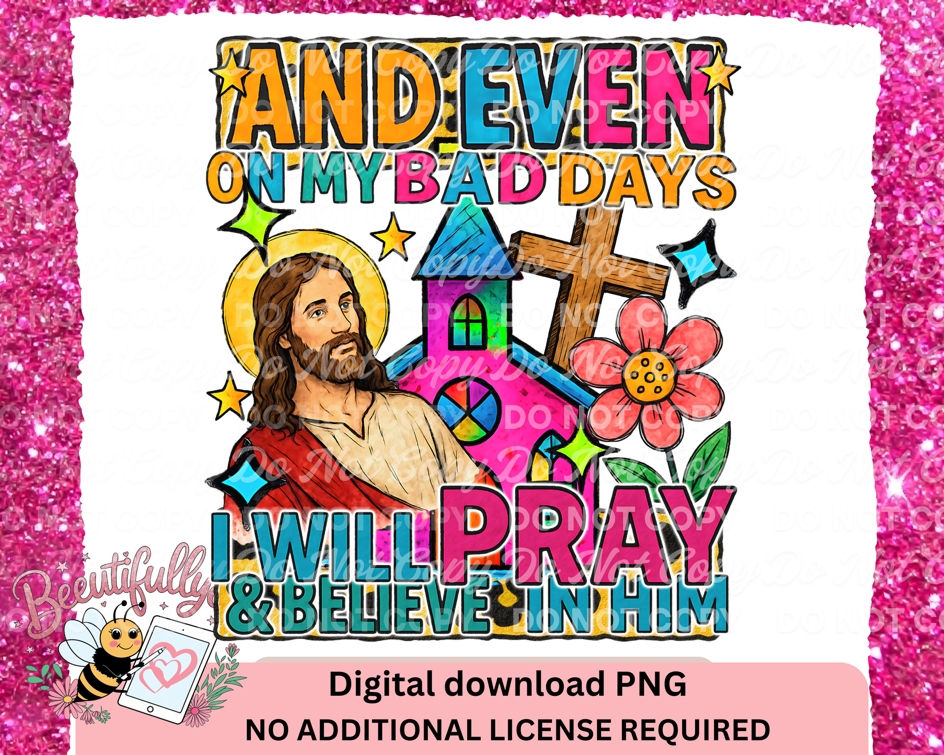 This colorful and heartfelt Christian PNG design features Jesus, a vibrant church, and uplifting text that reads, "And even on my bad days I will pray & believe in Him." Perfect for faith-based apparel, tote bags, mugs, and more. The bright, bold colors and doodle-style artwork add a cheerful and hopeful vibe to any project.