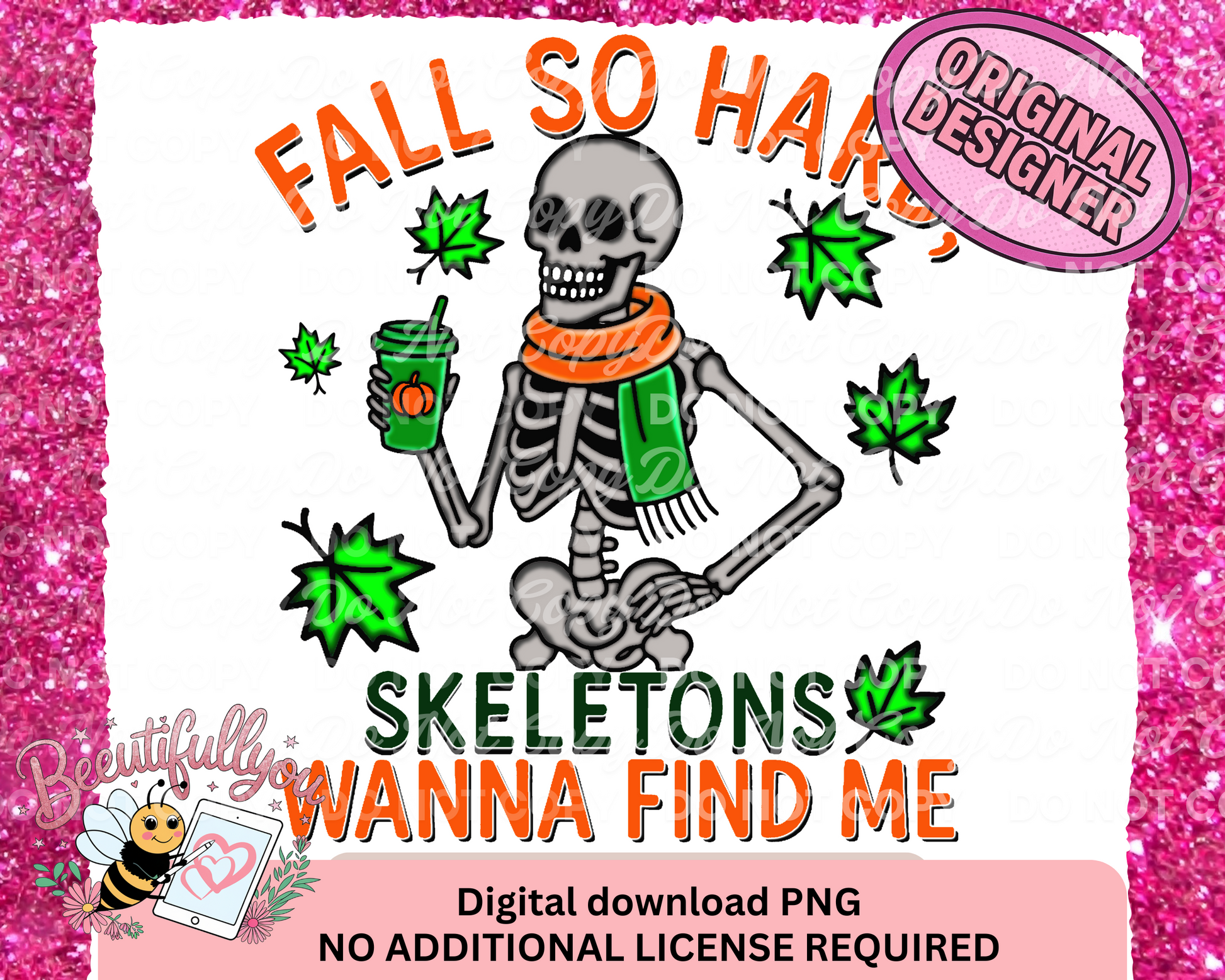 “FALL SO HARD, SKELETONS WANNA FIND ME” – a punny twist perfect for fall fashionistas and spooky season lovers!