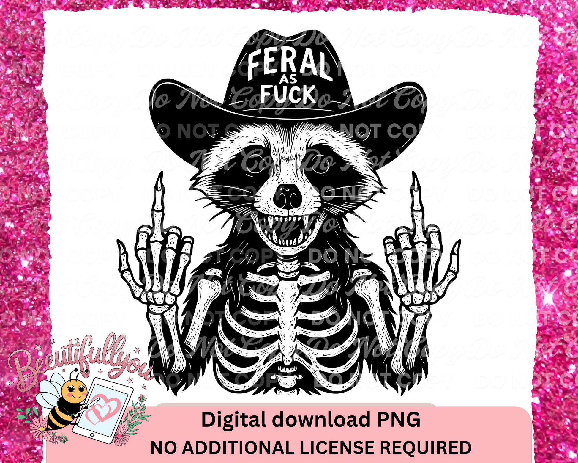 Let your wild side shine with this “Feral As F*ck” raccoon PNG! Featuring a grinning skeleton raccoon in a cowboy hat flipping the bird, this bold and badass black-and-white graphic is perfect for tees, tumblers, stickers, or sassy wall art. Ideal for those who live unapologetically feral – no filter, no shame.