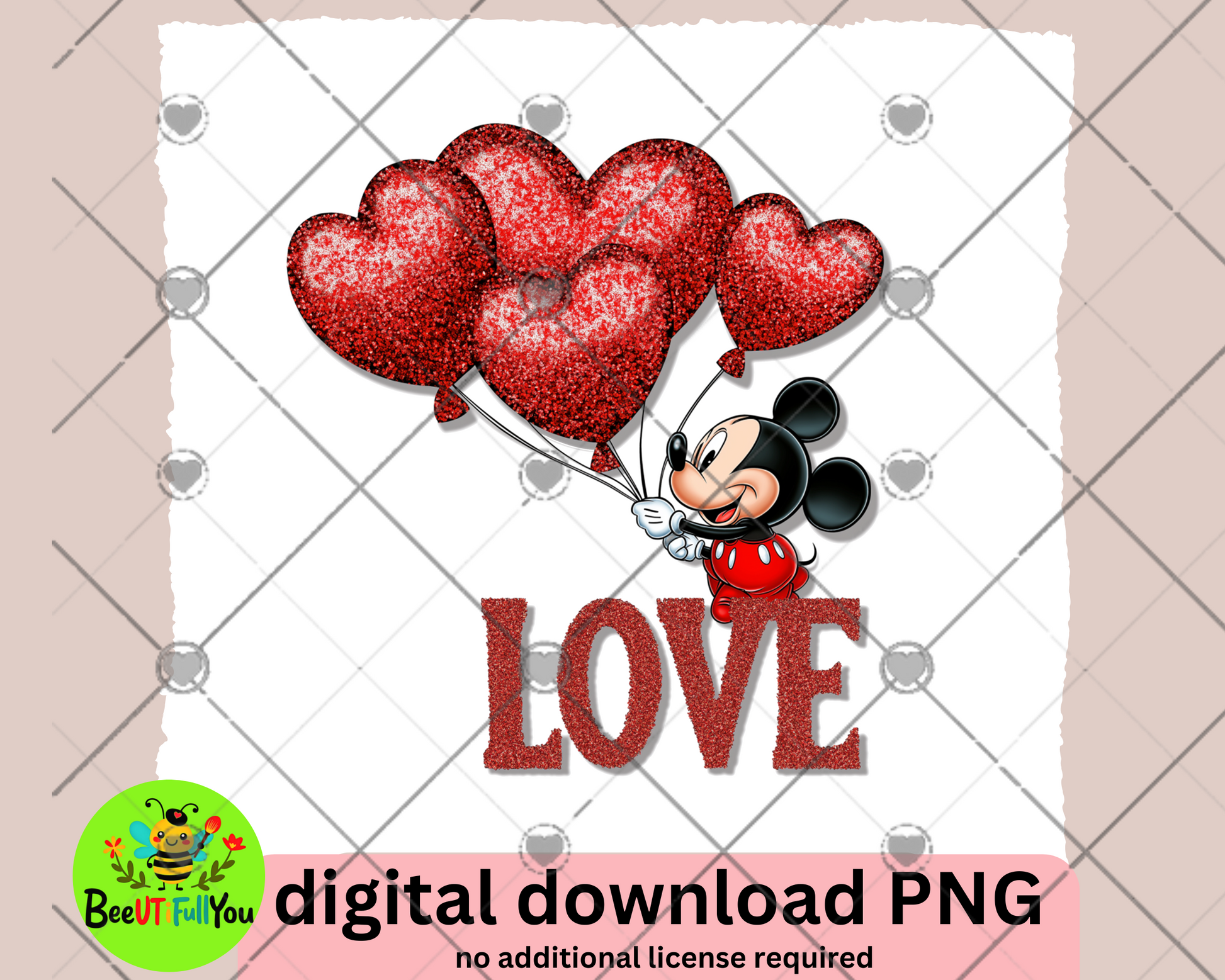 Add a touch of magic to your Valentine’s projects with this charming Mickey-inspired design. Featuring glittery red heart balloons and the word “LOVE” in vibrant glitter text, this high-quality PNG file is perfect for creating Valentine’s Day crafts, t-shirts, mugs, or decor. Bring love and fun into your creations with this adorable design!