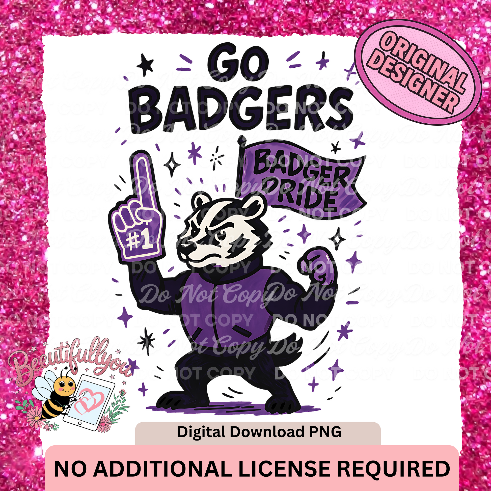 Show off your school pride with this bold and fierce Badger mascot! Featuring hand-drawn marker-style textures, this finished design includes a badger holding a #1 foam finger and waving a “Badger Pride” flag — all in school spirit purple.