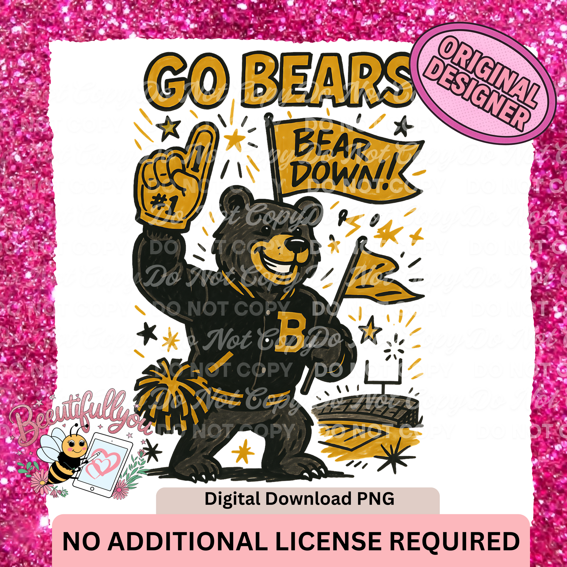 Show your fierce school pride with this one-of-a-kind hand-drawn Go Bears mascot PNG! Perfect for creating tees, signs, and custom spirit wear that roar with team energy. Whether itโs game day or pep rally season, this black-and-gold bear is ready to cheer your team on!