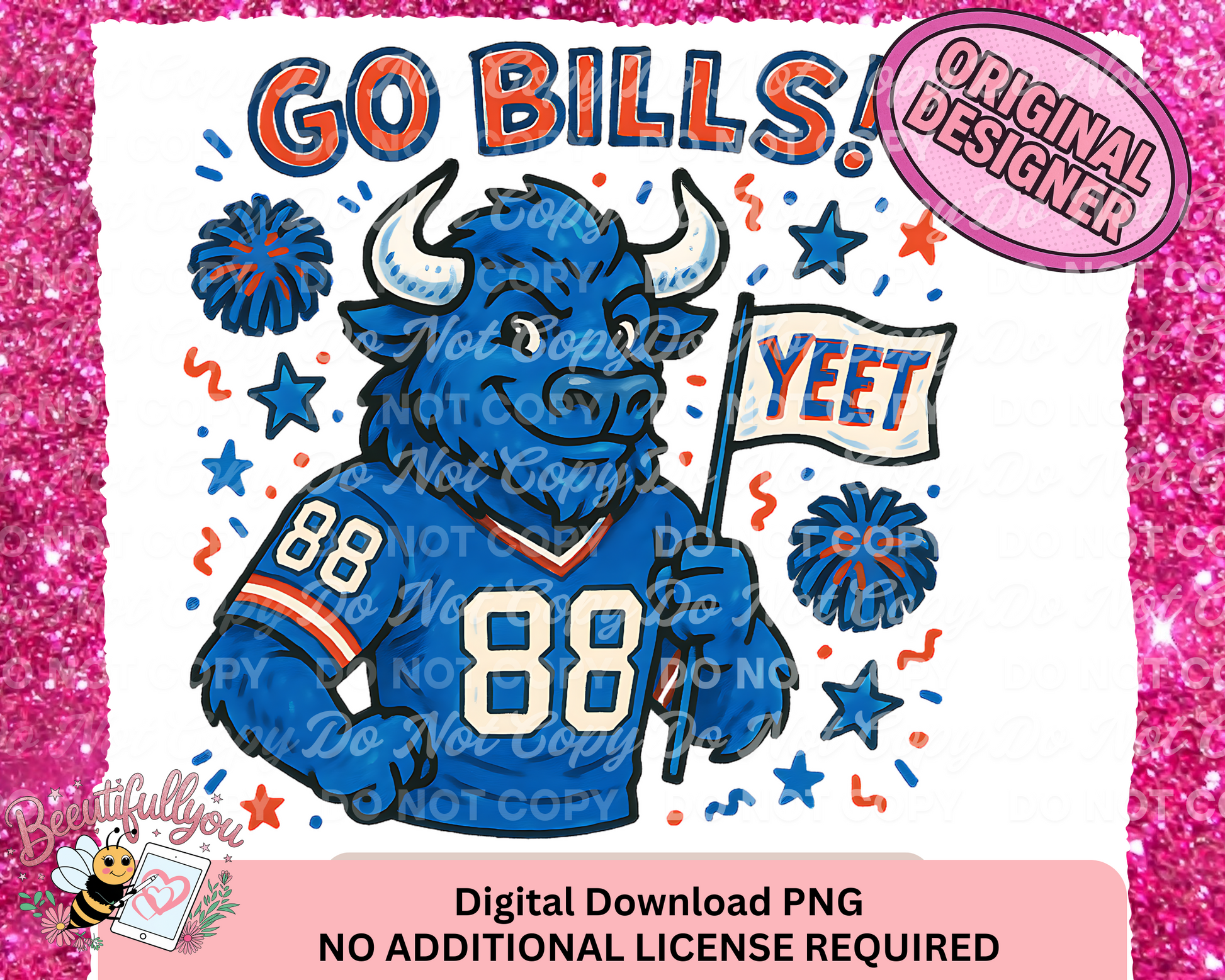 Bring the hype to your next tailgate or Sunday watch party with this bold, hand-drawn Buffalo Bills-inspired design! This pumped-up buffalo mascot is rockin' jersey #88, surrounded by stars, pom-poms, and holding a flag that proudly screams YEET.