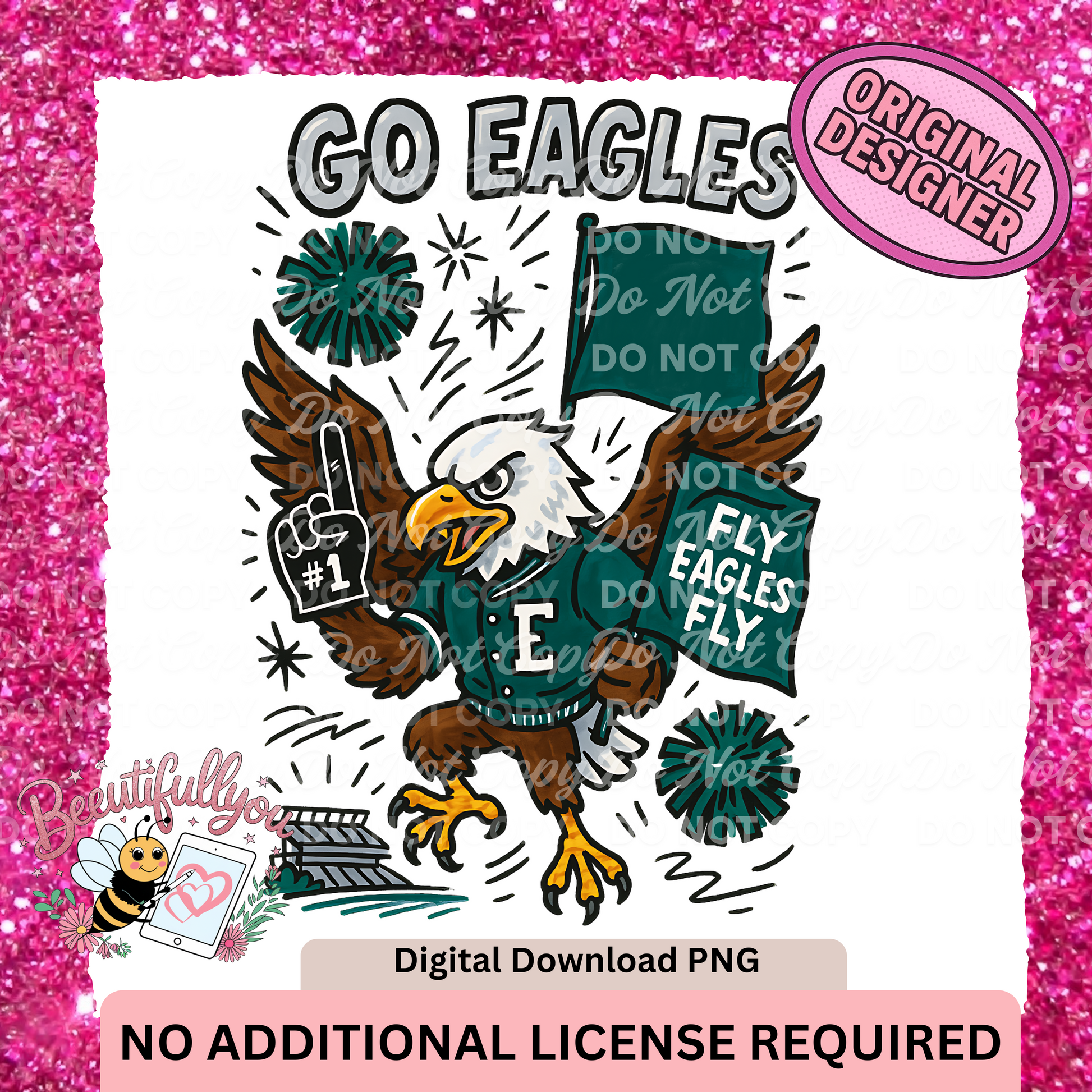 Show your eagle pride with this high-energy “Go Eagles” PNG design! Featuring a fierce bald eagle mascot mid-flight with a bold “Fly Eagles Fly” flag and foam finger, this design is perfect for school spirit gear, sports fans, and merch makers alike.