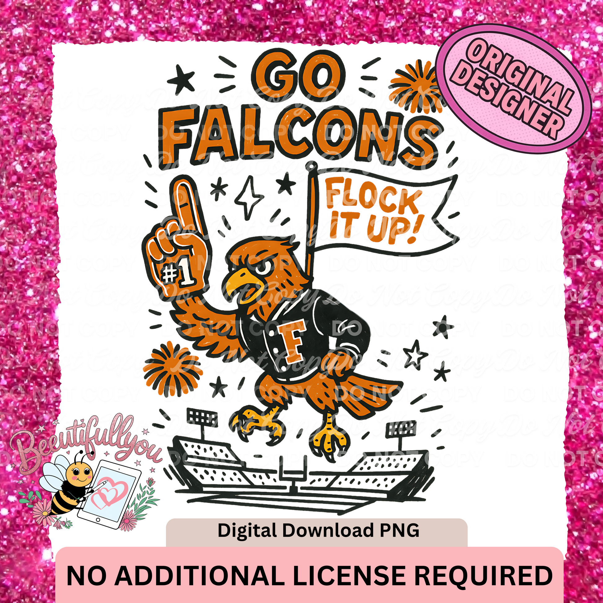 Time to FLOCK IT UP, Falcons fans! 🦅 This fiery, hand-drawn falcon mascot is swooping into spirit season with a varsity jacket, foam finger, and a fierce flag waving “Flock It Up!” Perfect for game day gear, spirit shirts, and fan apparel.