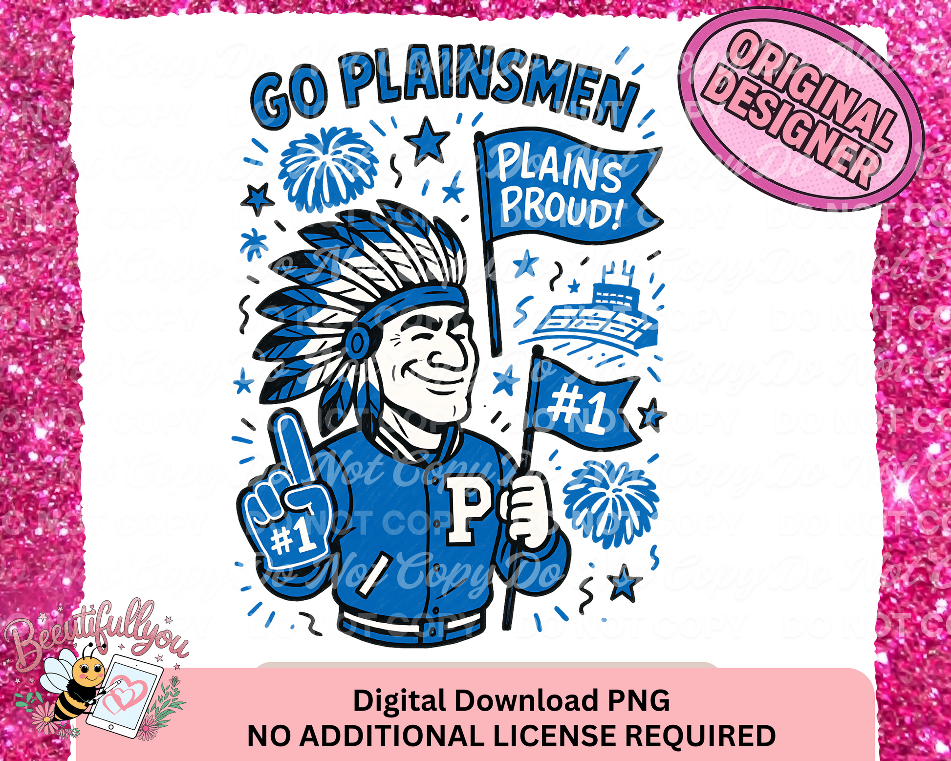 Show your team pride with this high-energy Plainsmen design! Featuring a bold mascot in full blue varsity gear, surrounded by fireworks, stars, and waving flags with “PLAINS PROUD” and “#1,” this design is bursting with school spirit and perfect for the whole fan section!