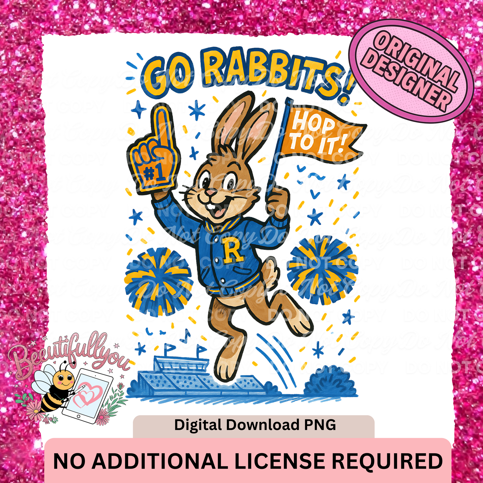 Hop into game day with this hand-drawn, cheer-tastic bunny mascot! Dressed in a varsity jacket and waving a flag that says "HOP TO IT", this energetic rabbit is surrounded by stadium excitement, pom-poms, and confetti. A must-have for team spirit season!