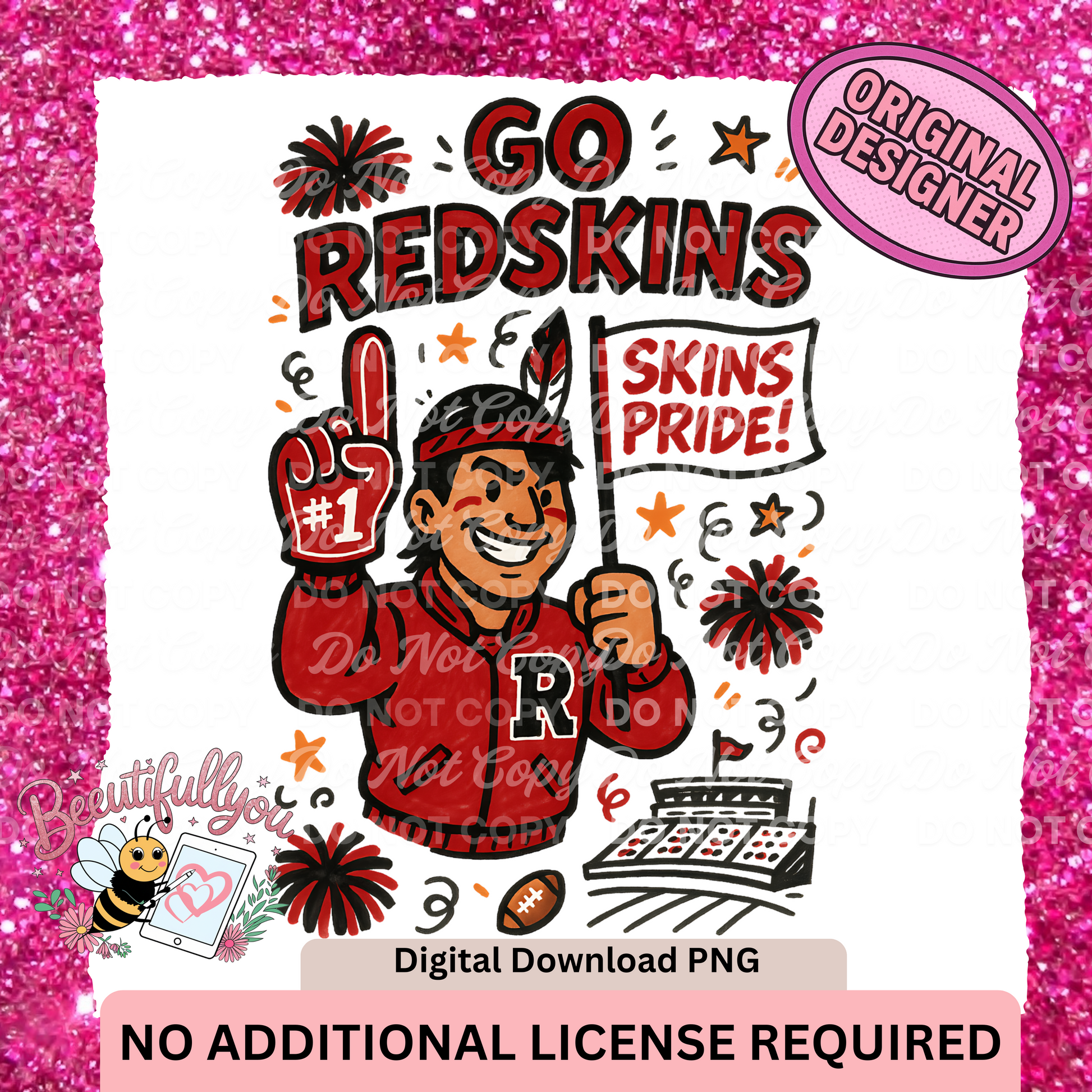 Show your Skins Pride with this powerful and spirited Redskins mascot digital design! Featuring a confident varsity mascot in a red & black jacket, foam finger, pennant flag, and stadium scene—this hand-drawn PNG brings all the pep and pride to your custom creations! ❤️🖤🏈