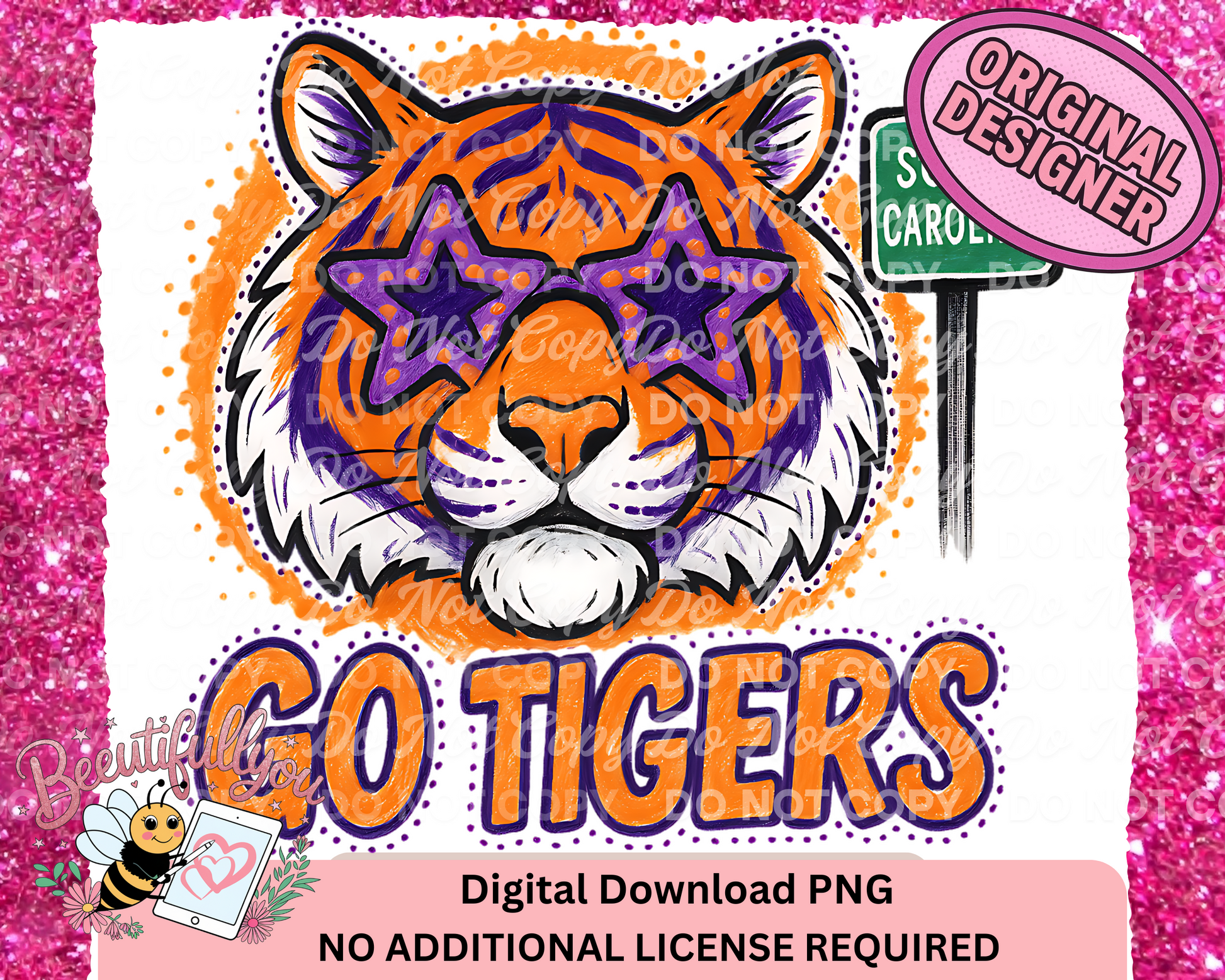Get fierce and festive with this Go Tigers PNG design! Featuring a hand-drawn tiger in star-shaped purple glasses and a South Carolina street sign, this digital file is perfect for spirited shirts, totes, and tailgating gear.