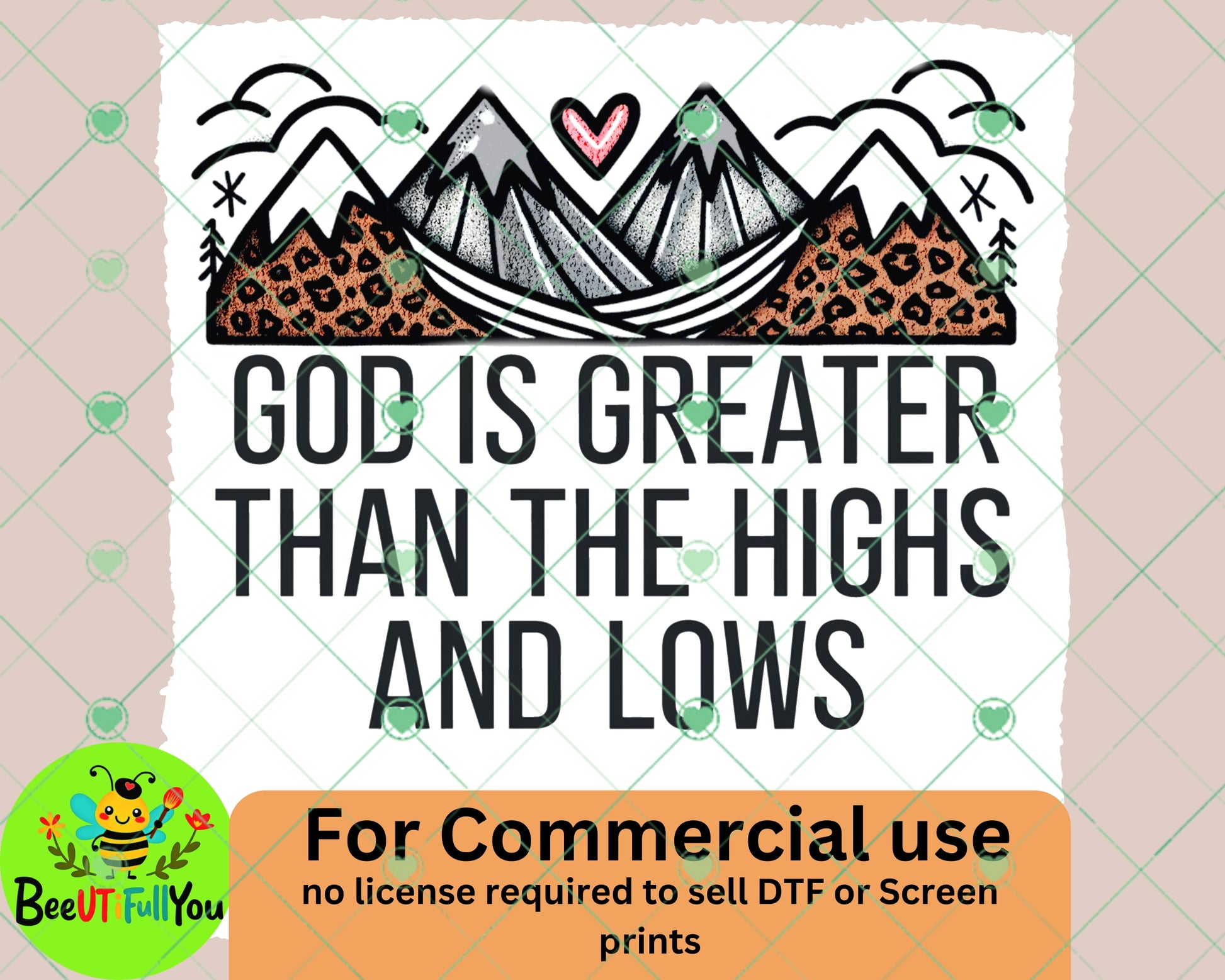 - Main Design: Bold typography with "God is Greater Than the Highs and Lows" overlayed on mountain graphics with leopard print detailing.