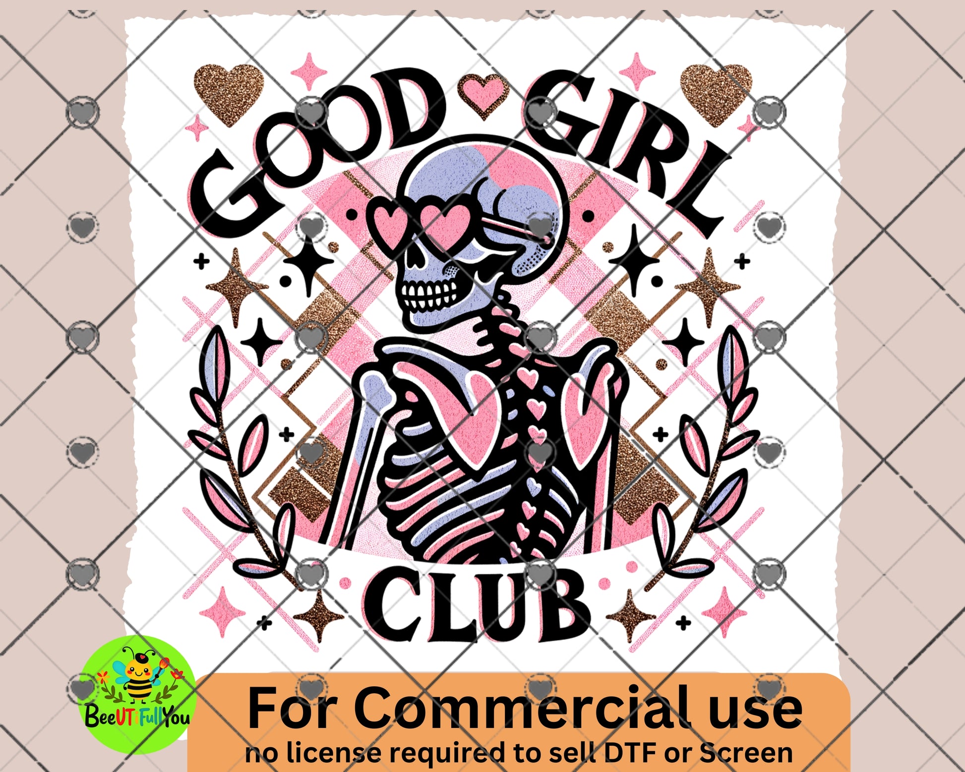 Join the "Good Girl Club" with this fun and flirty skeleton design! Perfect for anyone who loves a mix of cute and spooky vibes, this design is great for shirts, mugs, and more.