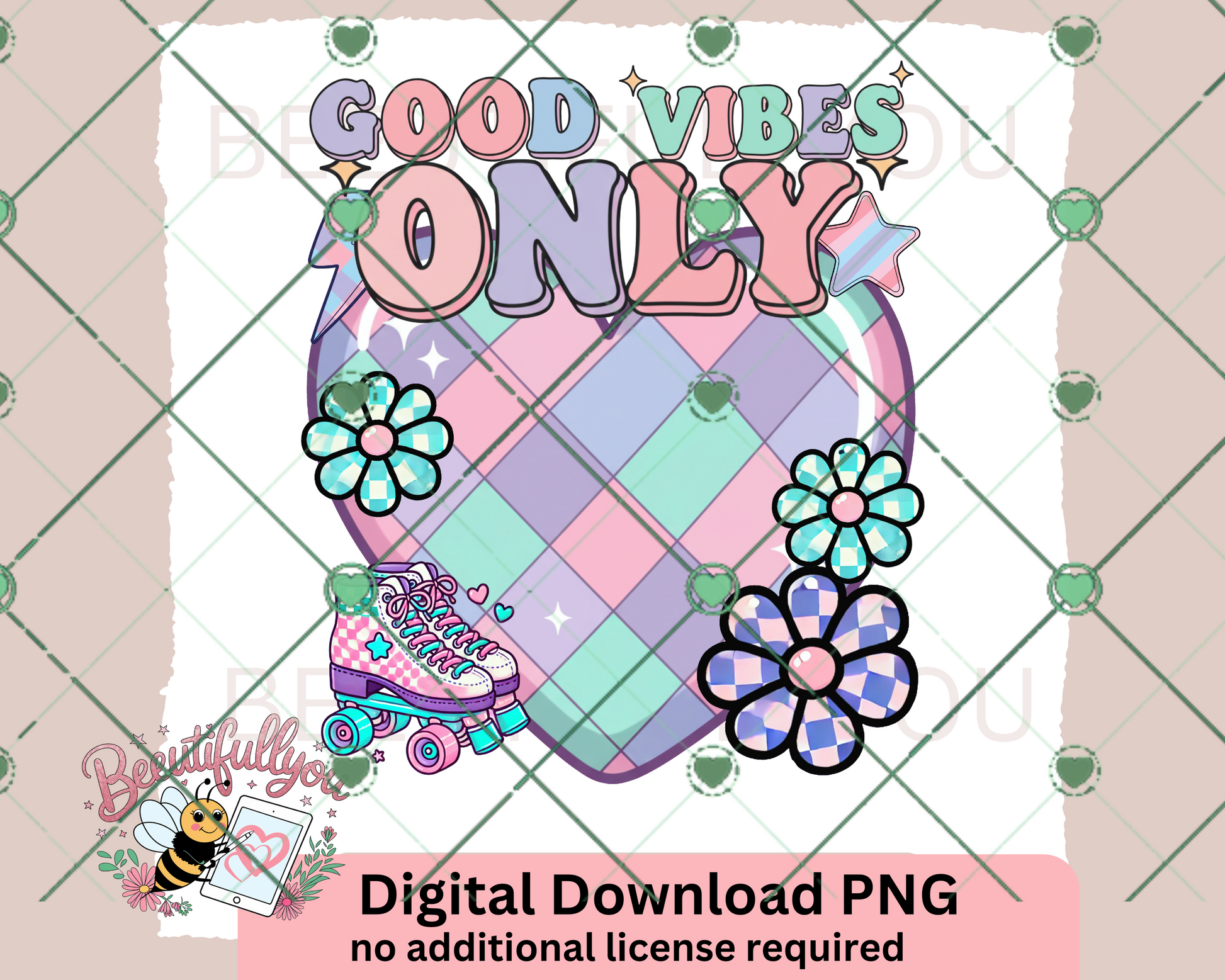 Spread positivity in full pastel power with this Good Vibes Only digital PNG! Featuring a colorful retro heart, chunky bubble letters, playful daisies, and a nostalgic roller skate – this design is perfect for anyone chasing joy and keeping the vibes high. Whether it’s a tee for a skate party or a tumbler for your daily coffee, this cutie brings instant smiles.