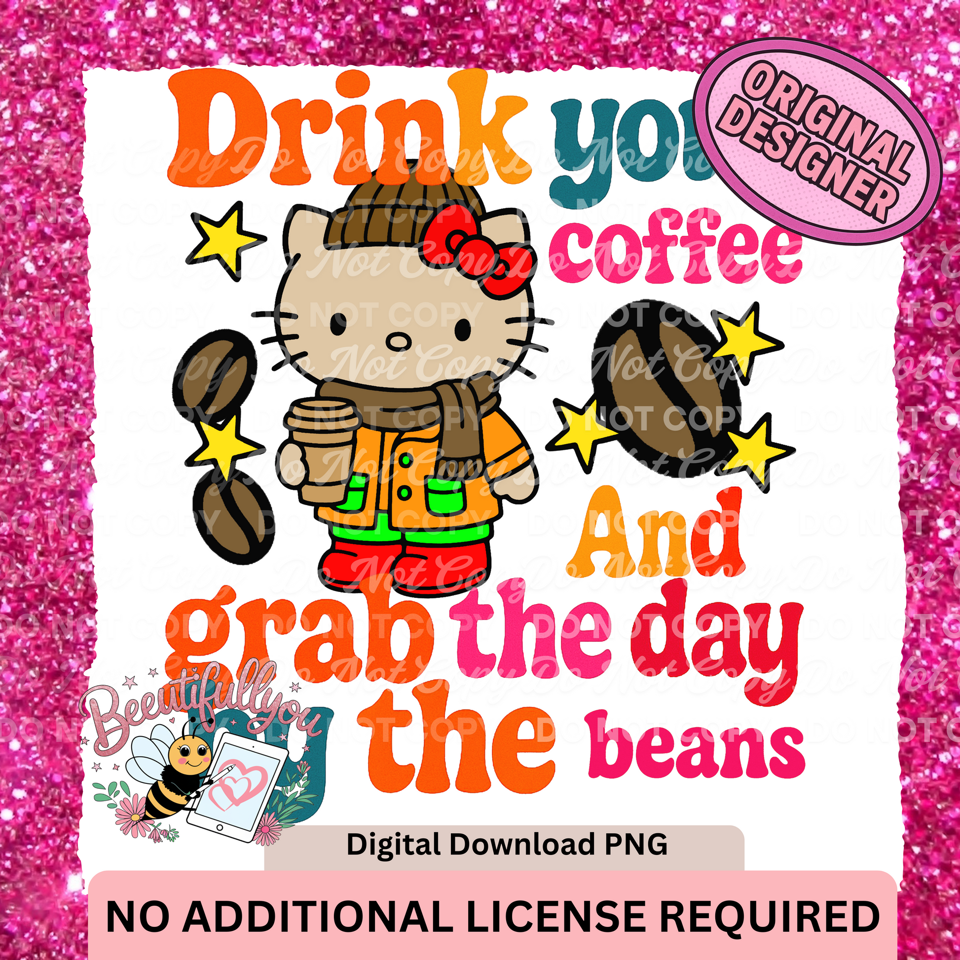Start your day with sass and espresso strength! ☕ This cozy fall PNG design features an adorable kitty bundled in autumn gear, coffee in paw, and a bold message: “Grab the day by the beans.” Perfect for coffee lovers with attitude and humor!