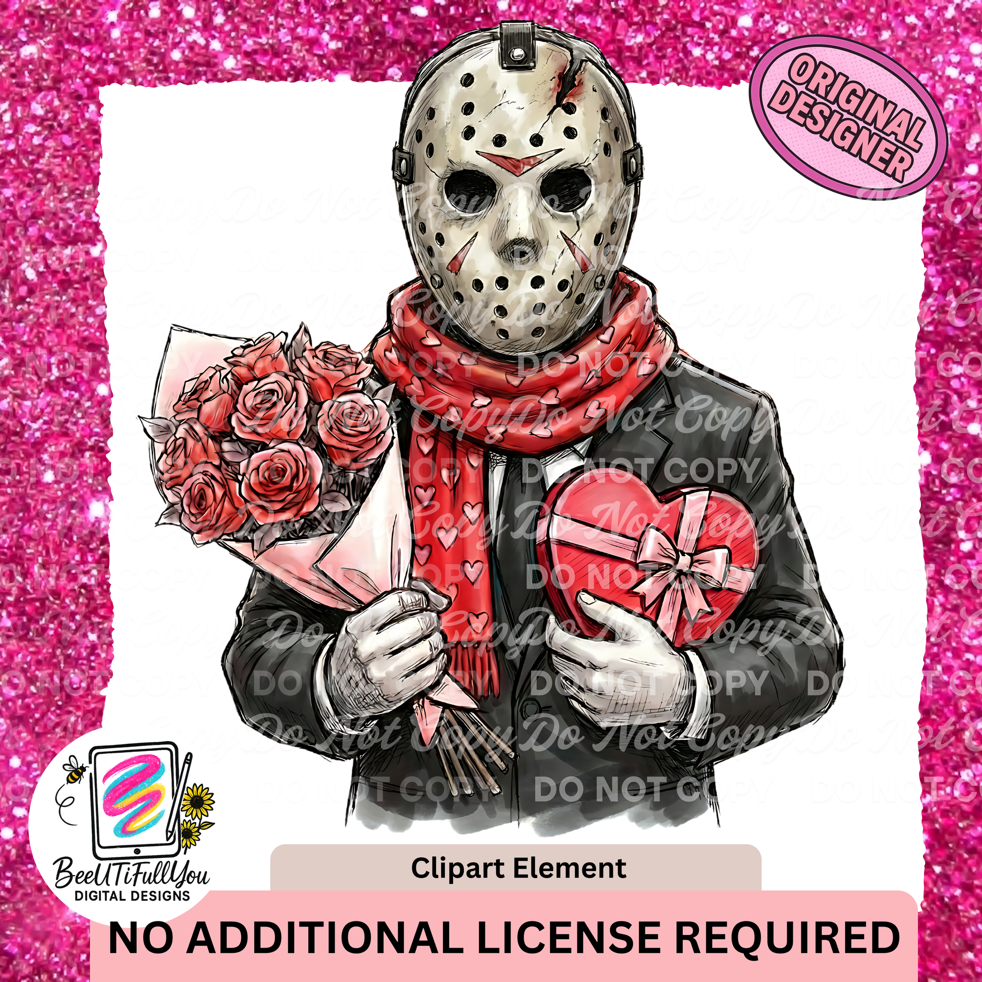 Bring some twisted Valentine charm to your designs with this Horror Valentine Clipart Pack! This set features four hand-drawn creepy-cute characters (Chucky, Jason, Pennywise & Freddy), each holding a bouquet of roses and a heart-shaped candy box — perfect for snarky Valentine’s shirts, mugs, stickers, tumblers, sublimation, and more.