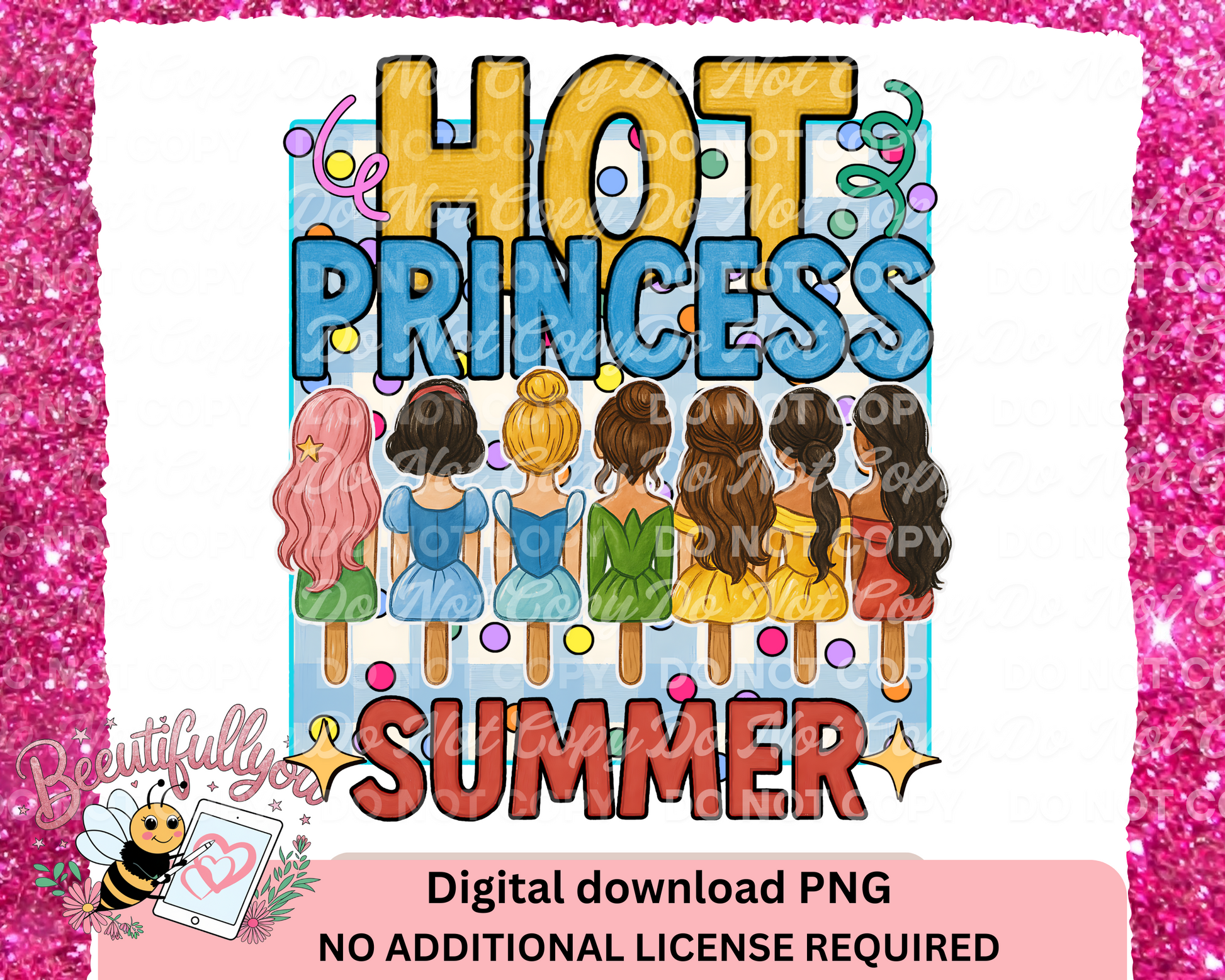 Add some sass and summer sweetness to your projects with this HOT Princess Summer PNG! Featuring a row of iconic princesses as popsicles from the back, this playful and vibrant design is perfect for girly summer apparel, tumblers, tote bags, and more. The fun text "HOT PRINCESS SUMMER" makes it a standout choice for all your sassy seasonal creations.