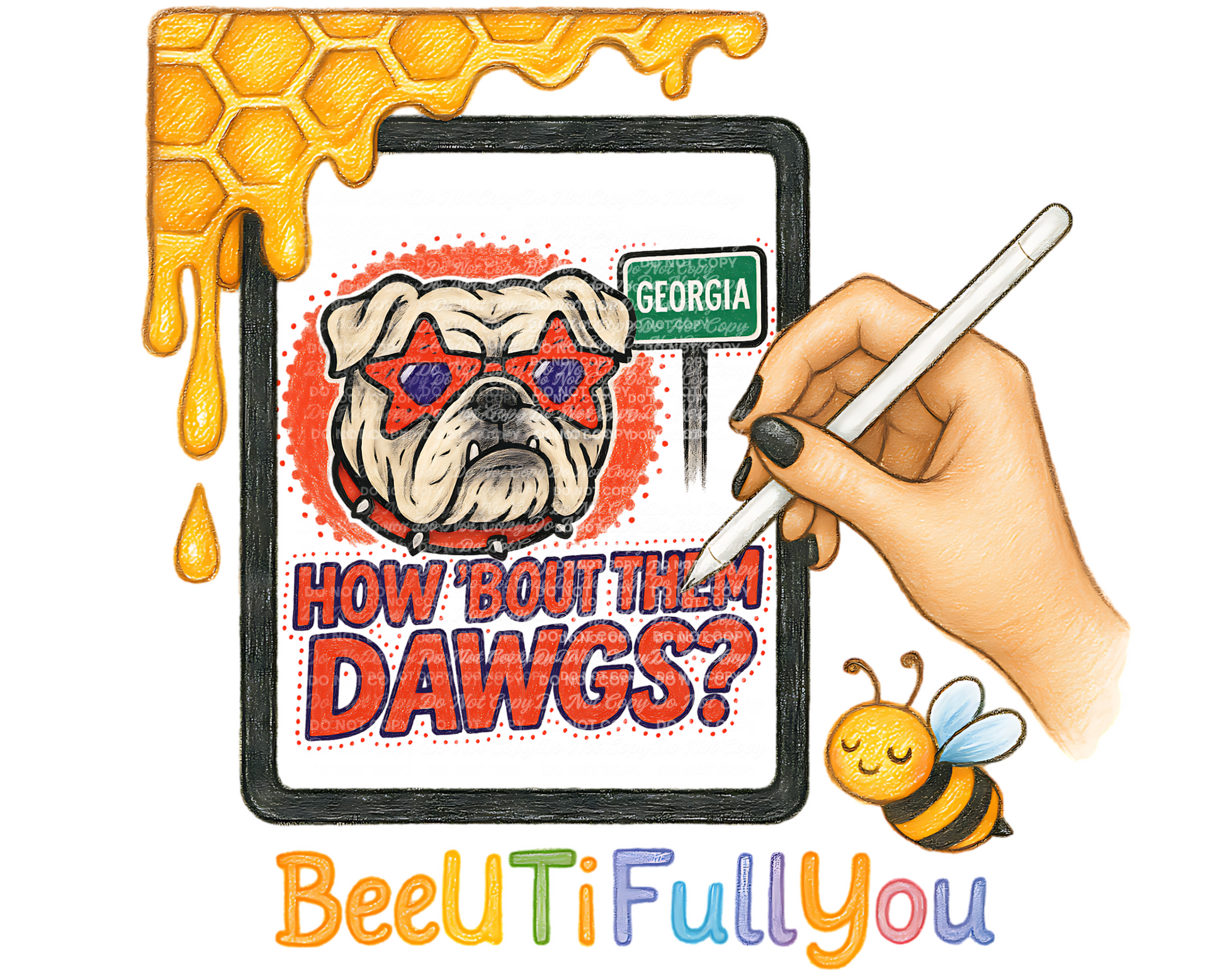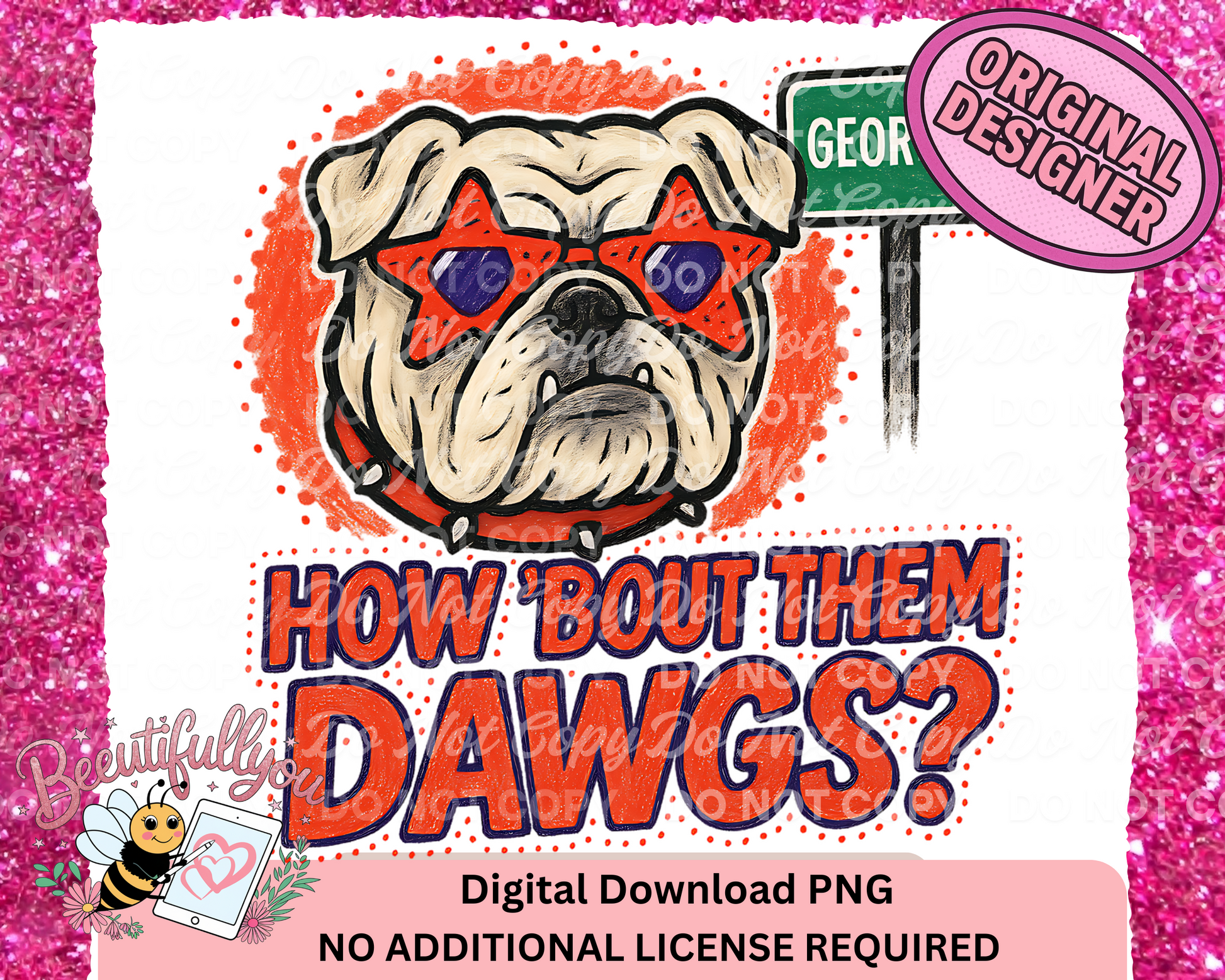 Show off your Georgia pride with this bulldog mascot PNG featuring bold text, a Georgia street sign, and red star glasses! Perfect for creating spirited apparel and tailgate-ready merch.