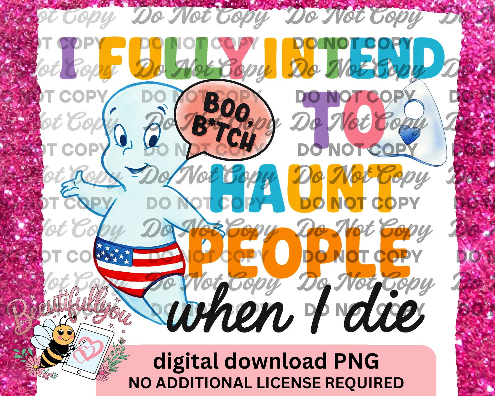 Add a hilarious, patriotic twist to your spooky season designs with this I Fully Intend to Haunt People When I Die PNG! Featuring a cheeky ghost in star-spangled undies, a bold rainbow font, and a sassy “Boo B*tch” bubble, this design brings the perfect mix of cute, creepy, and chaotic.