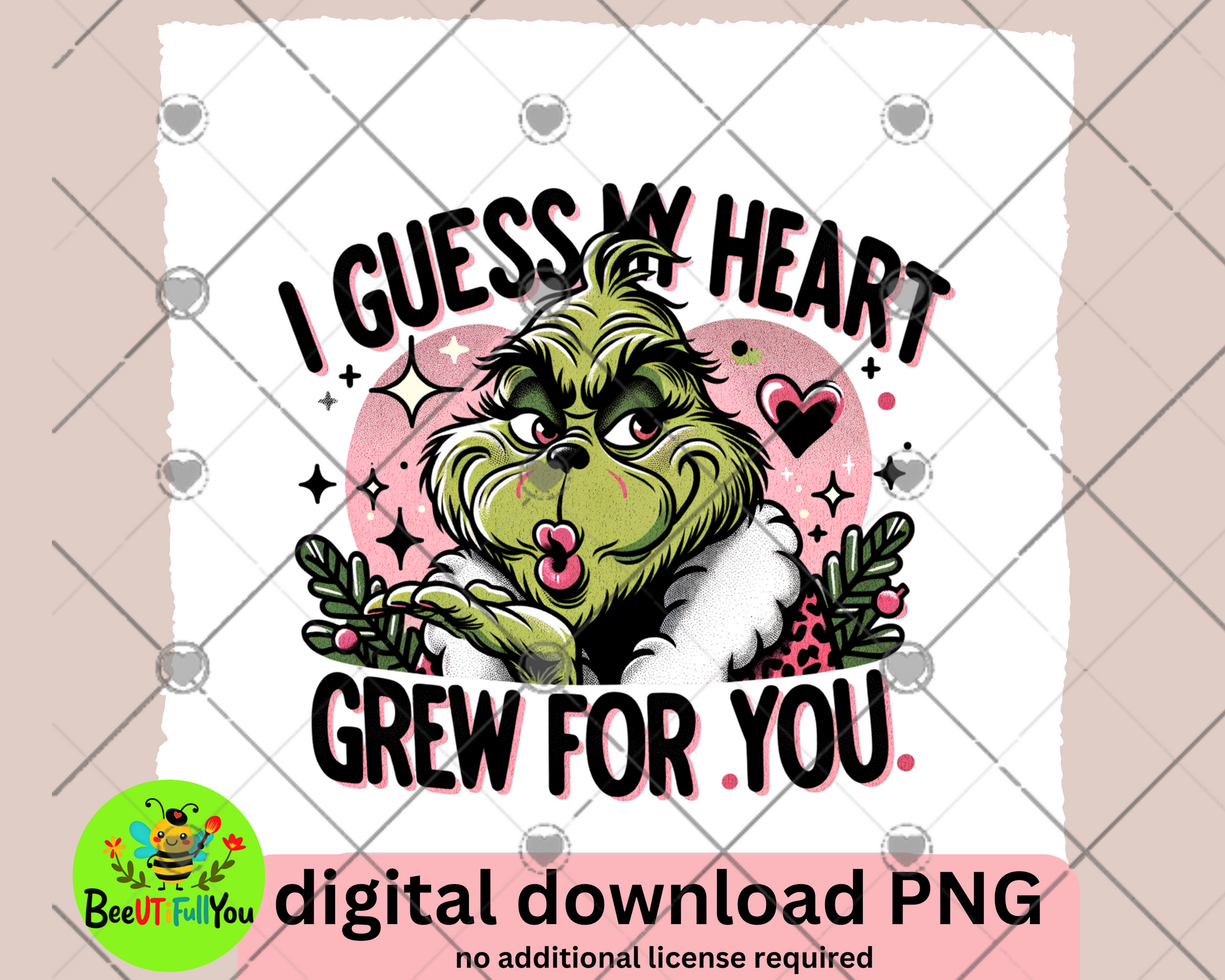 Celebrate Valentine's Day with a playful twist using this "I Guess My Heart Grew for You" design. Featuring a cheeky green character surrounded by hearts and charming accents, this high-resolution PNG file is perfect for creating unique t-shirts, mugs, cards, and more.