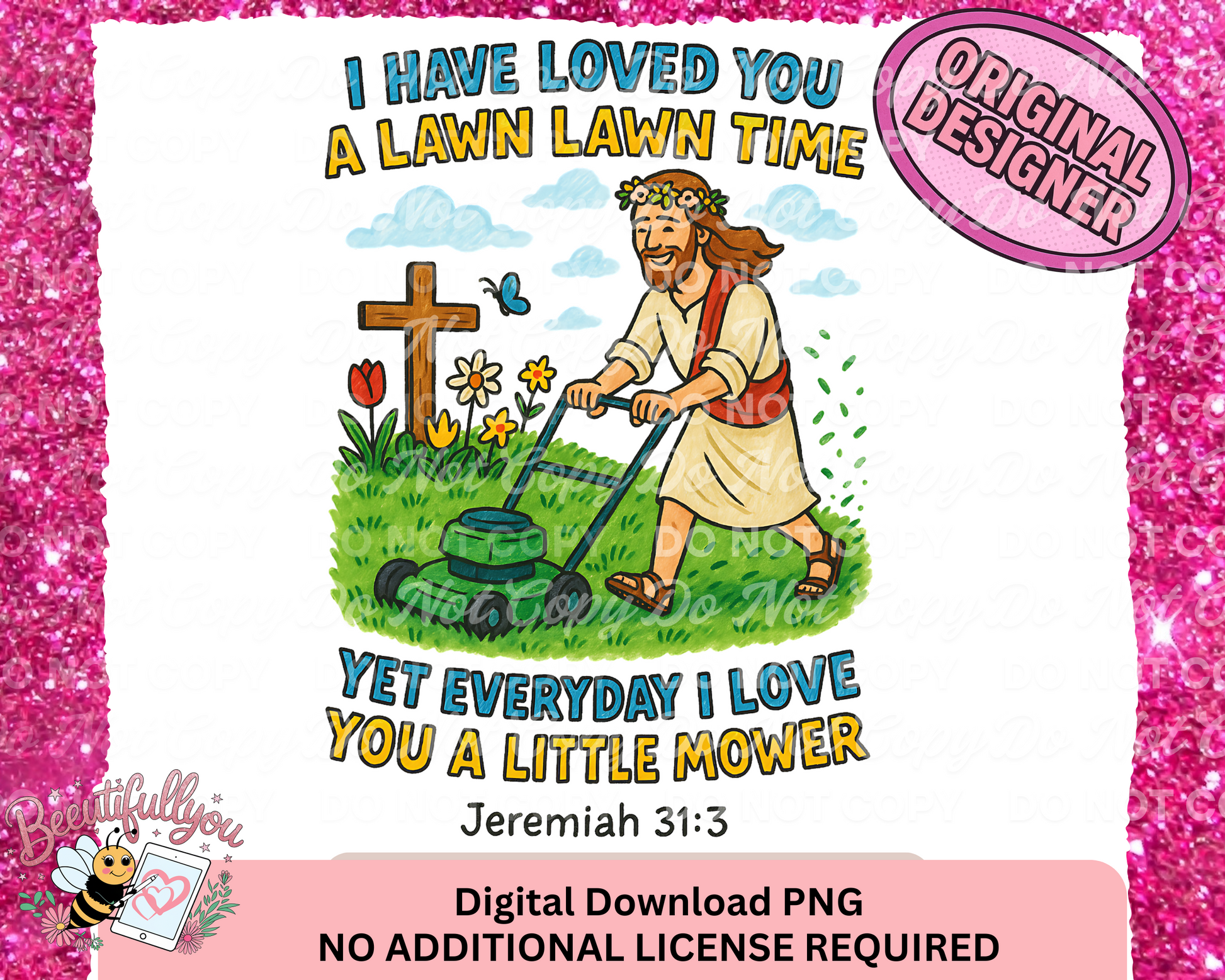 Need a little Jesus with your dad jokes? This playful digital design blends wholesome Scripture with a punny twist that’s perfect for spring, summer, or Father’s Day shirts! Featuring Jesus joyfully mowing the lawn (with divine accuracy), this file is ideal for your faith-based and funny product lines.