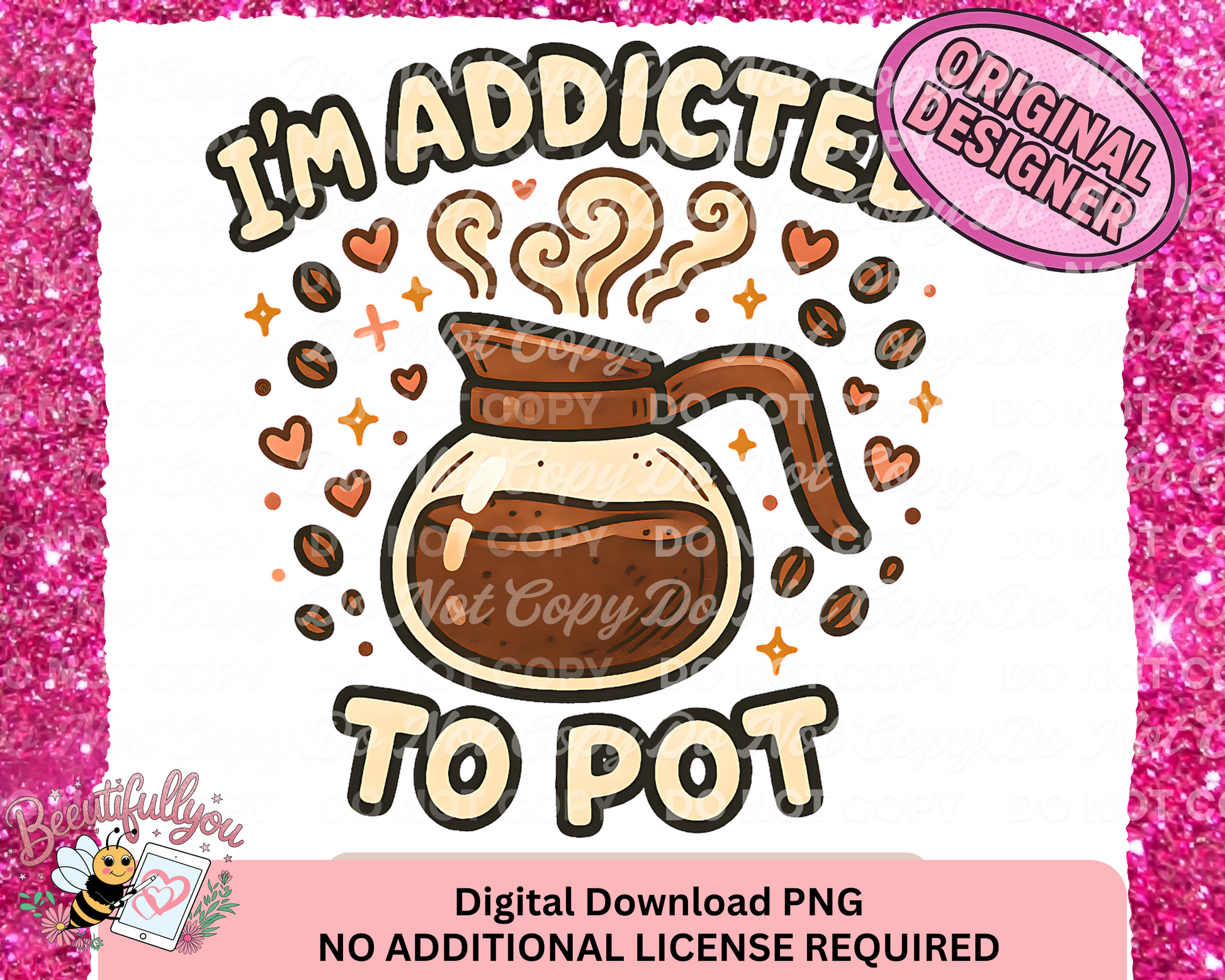• Text: “I’m Addicted to Pot” in bold, playful lettering