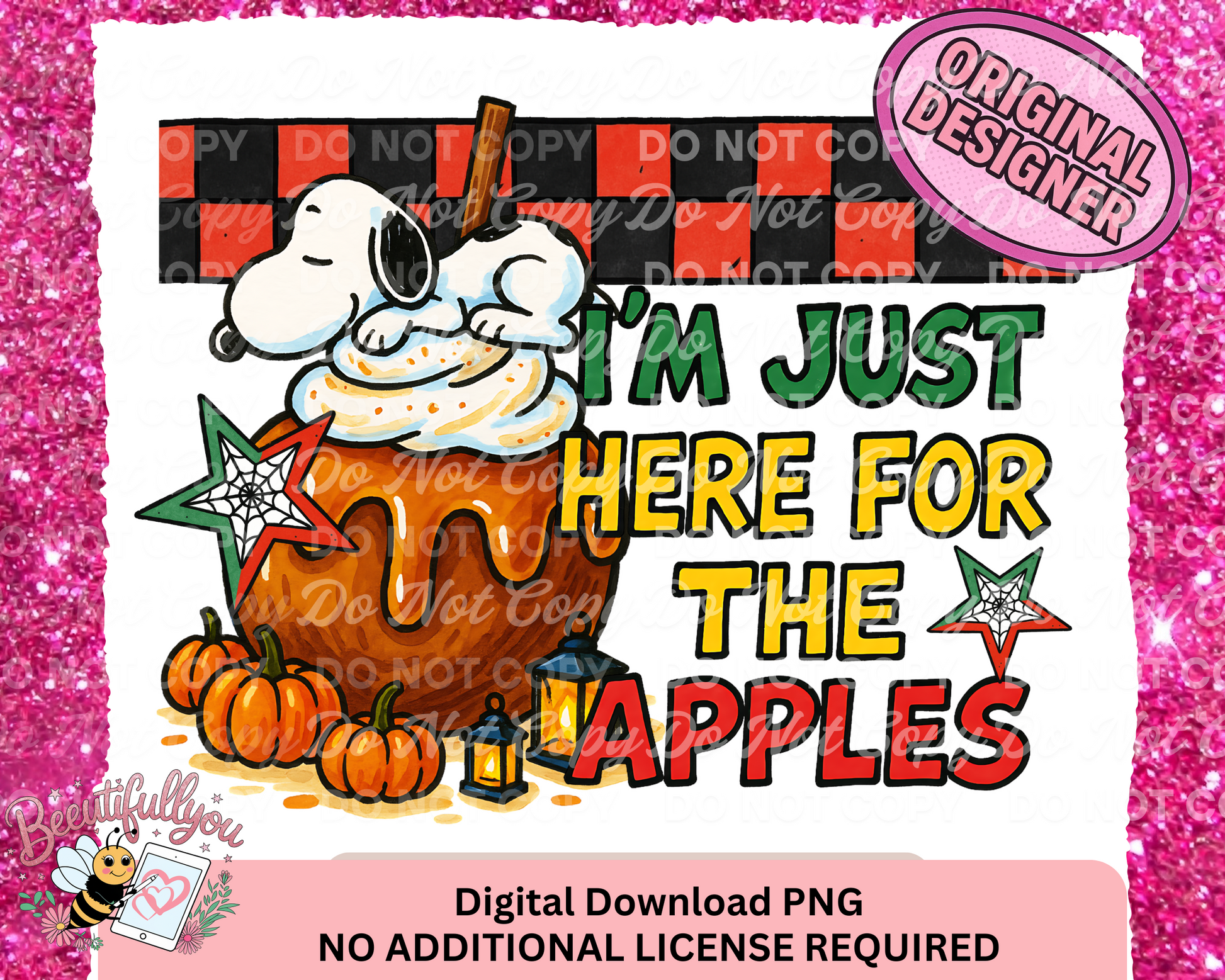 Forget the rides—I’m just here for the sticky, sweet, caramel-covered goodness! This cozy and cute fair-season design features a sleepy Snoopy snoozing on a caramel apple topped with whipped cream, surrounded by pumpkins, stars, and fall flair.