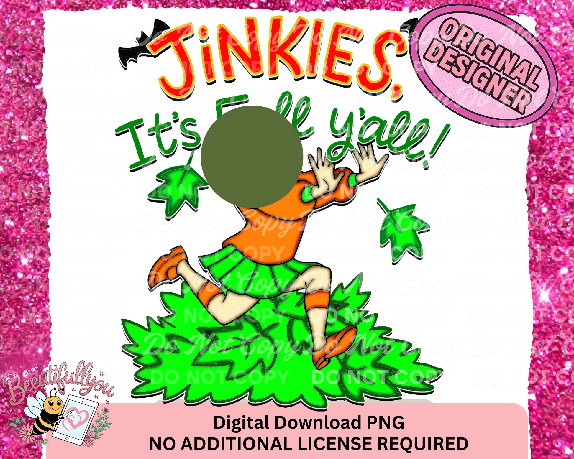 Celebrate spooky season with sass and nostalgia using this “Jinkies, It’s Fall Y’all!” PNG by BeeUTiFullYou! Featuring a retro mystery-squad-inspired character leaping through fall leaves in bright orange and green, this playful design is a perfect blend of fall and fandom.